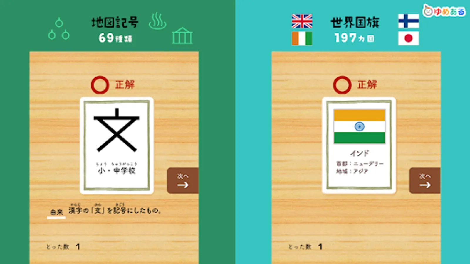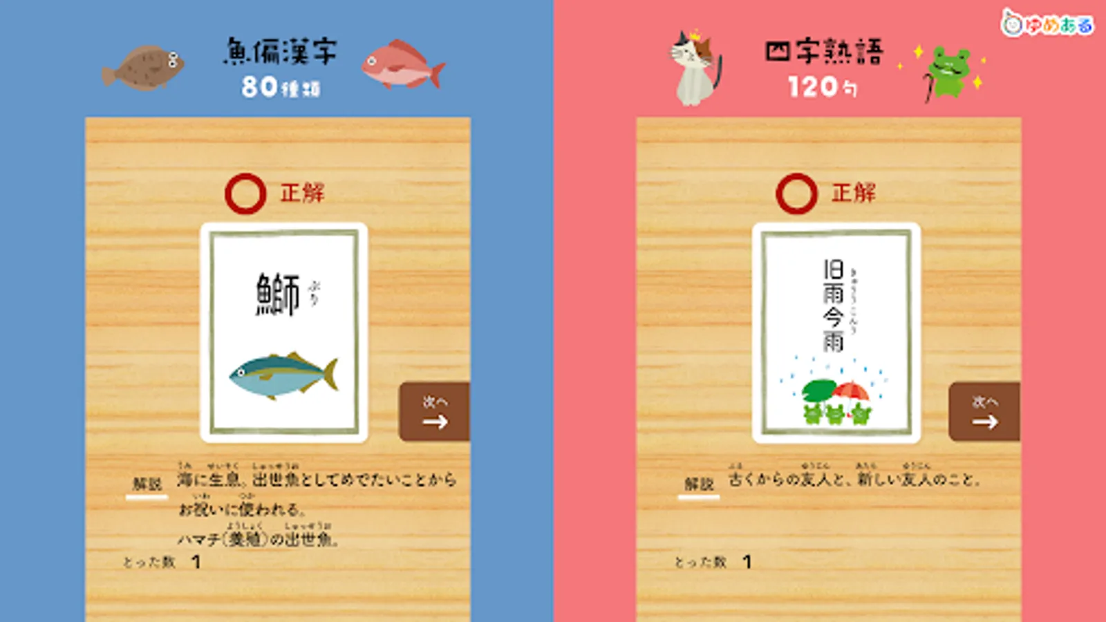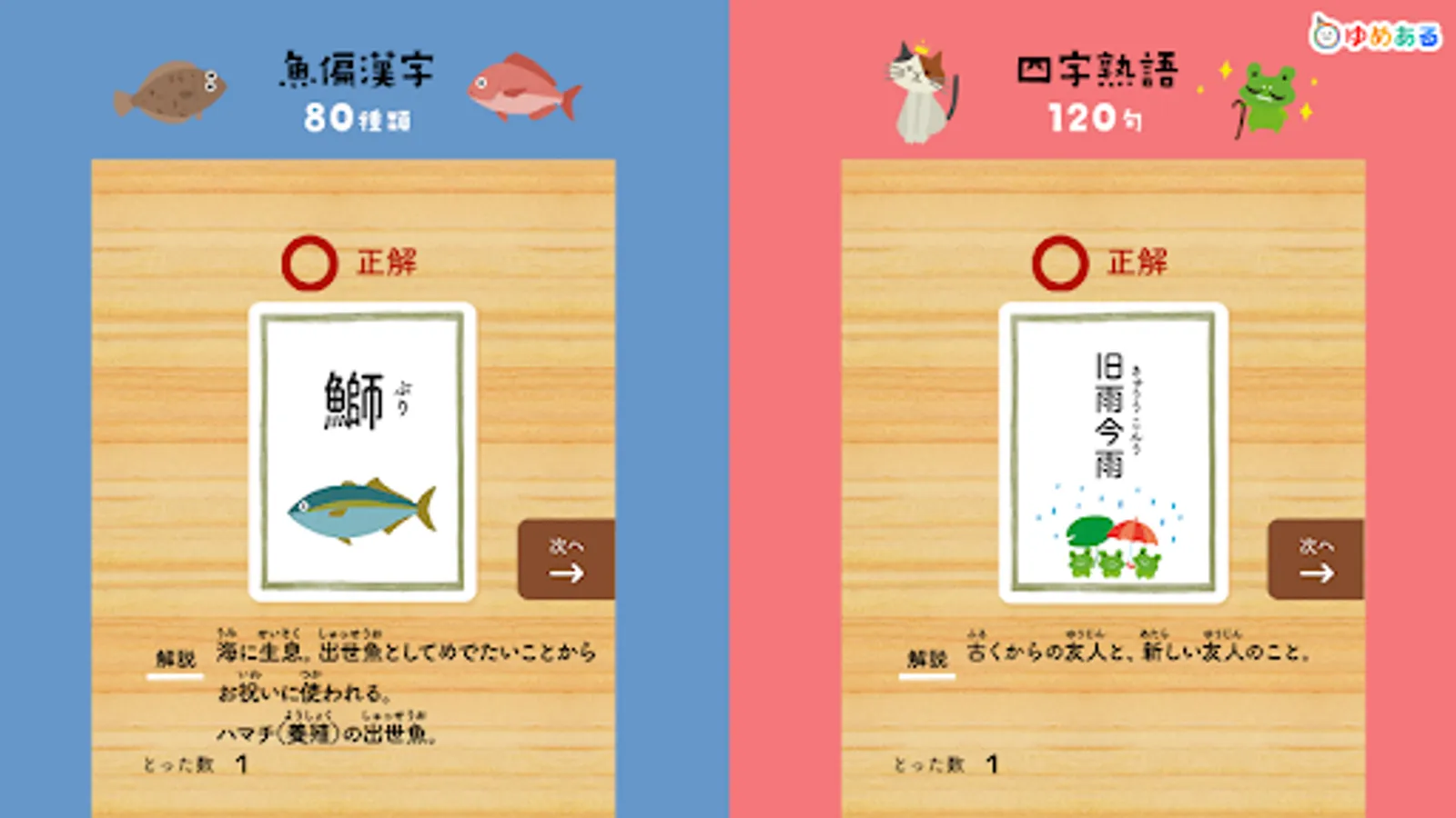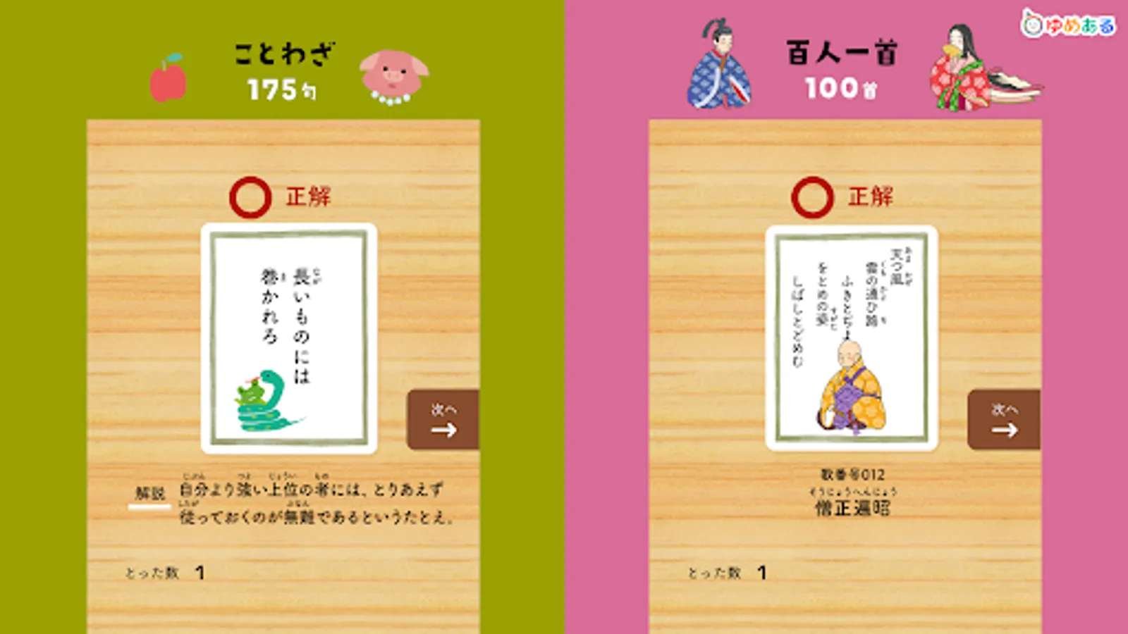 This is a learning app that helps you learn proverbs, Hyakunin Isshu, four-character idioms, fish-oriented kanji, prefectures, map symbols, world flags, historical eras, elemental symbols, and road signs while playing a karuta game.