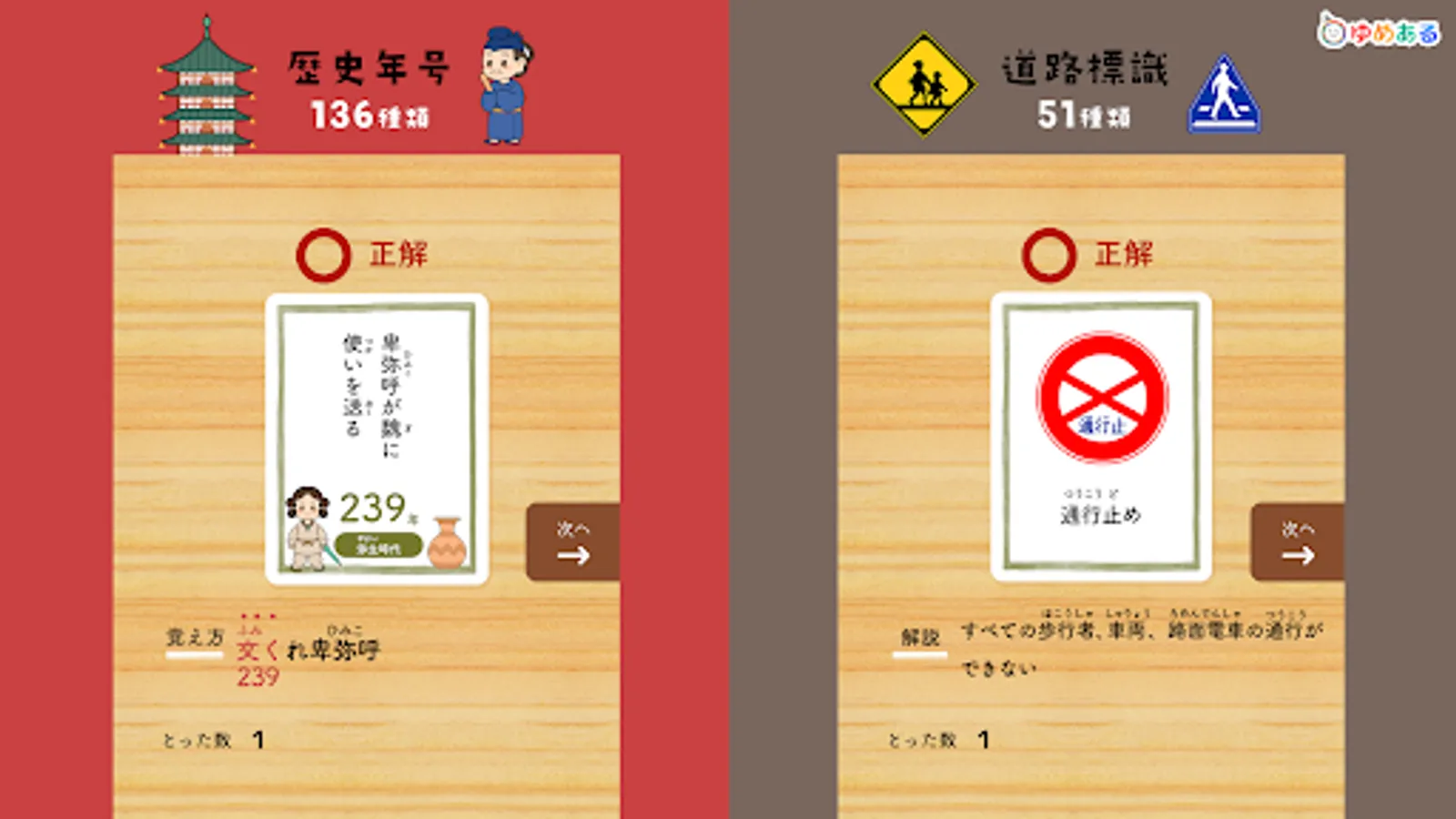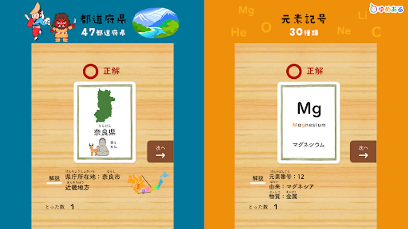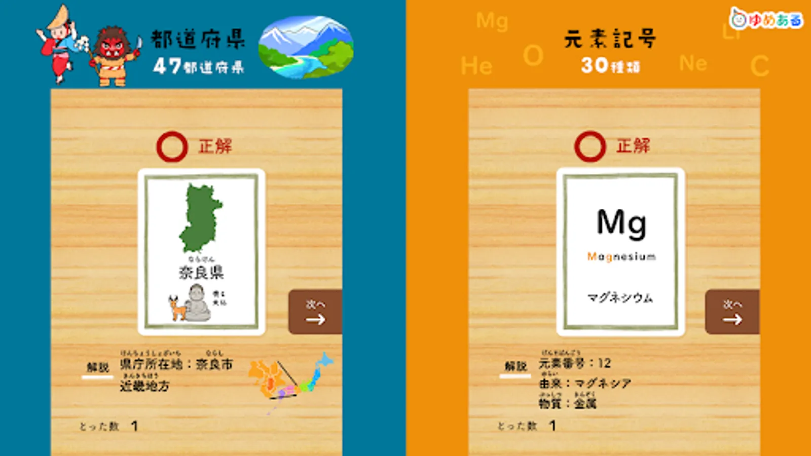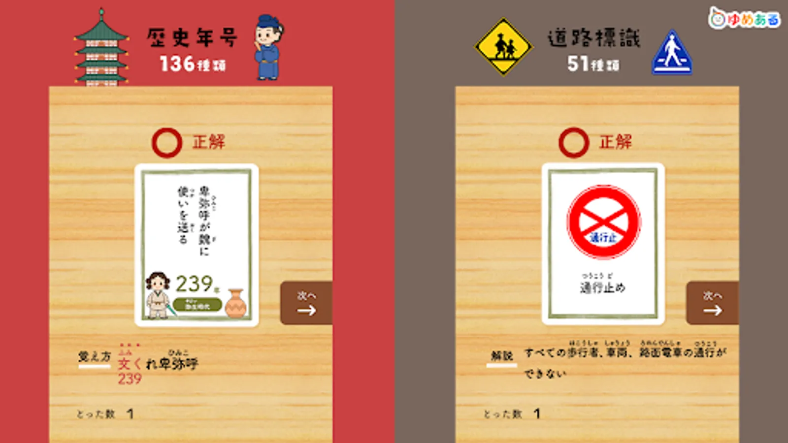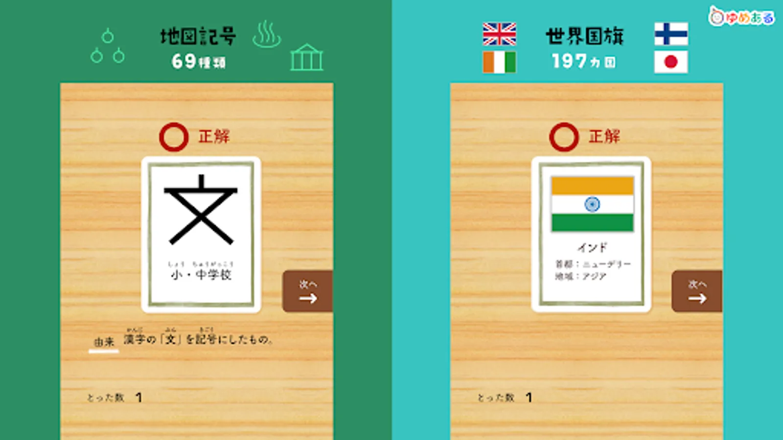 This is a learning app that helps you learn proverbs, Hyakunin Isshu, four-character idioms, fish-oriented kanji, prefectures, map symbols, world flags, historical eras, elemental symbols, and road signs while playing a karuta game.