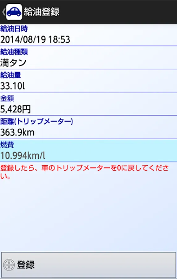 1.給油量と走行距離で燃費を計算します。