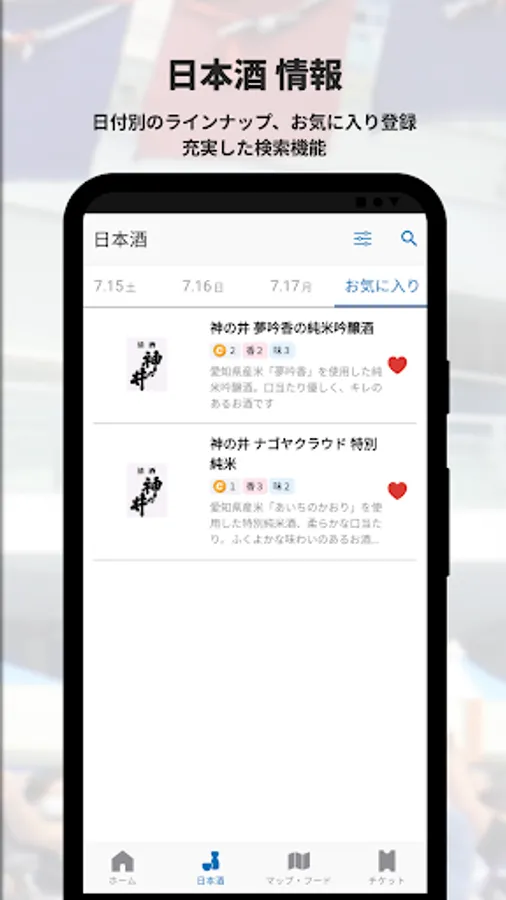 You can search for brand information of sake that can be tasted at the venue, and register as a favorite.