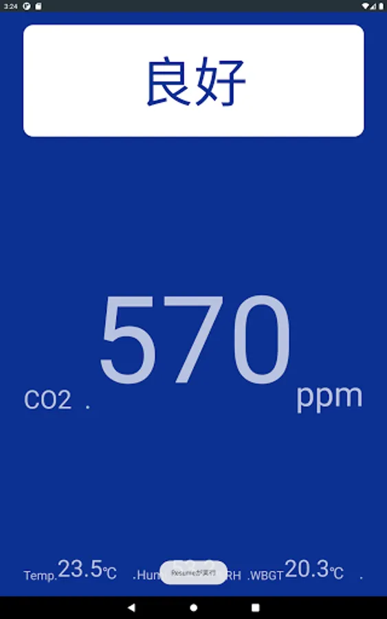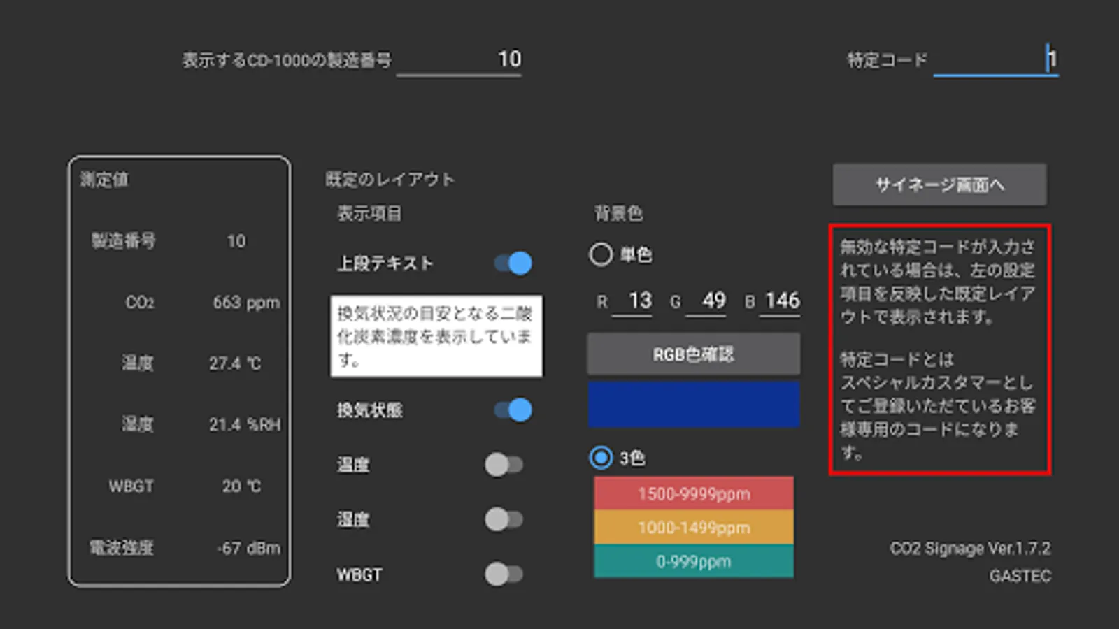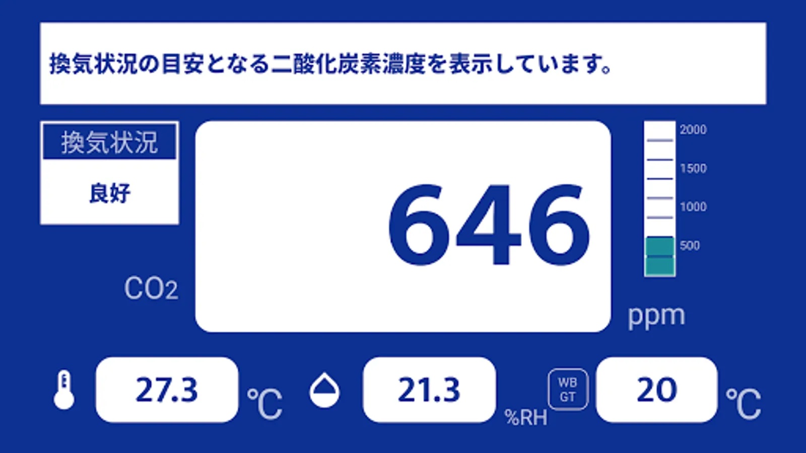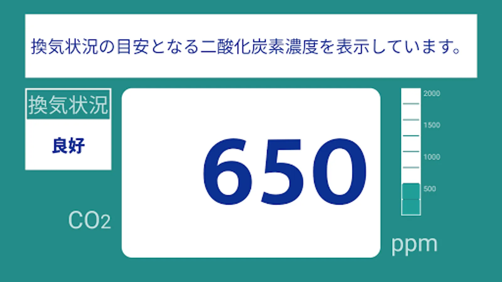 The value measured by the carbon dioxide concentration measuring device (model CD-1000) of Gastec Co., Ltd. can be displayed on a large screen as digital signage. It is an application for Android TV.