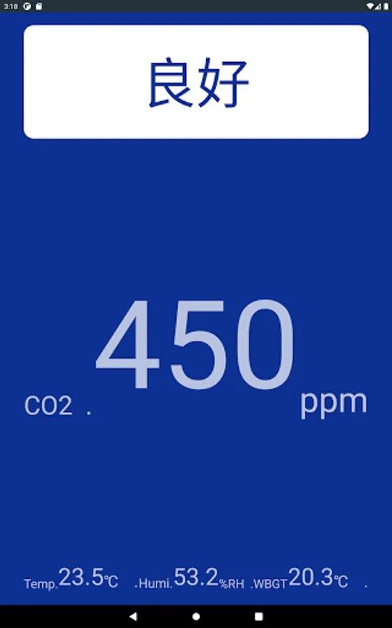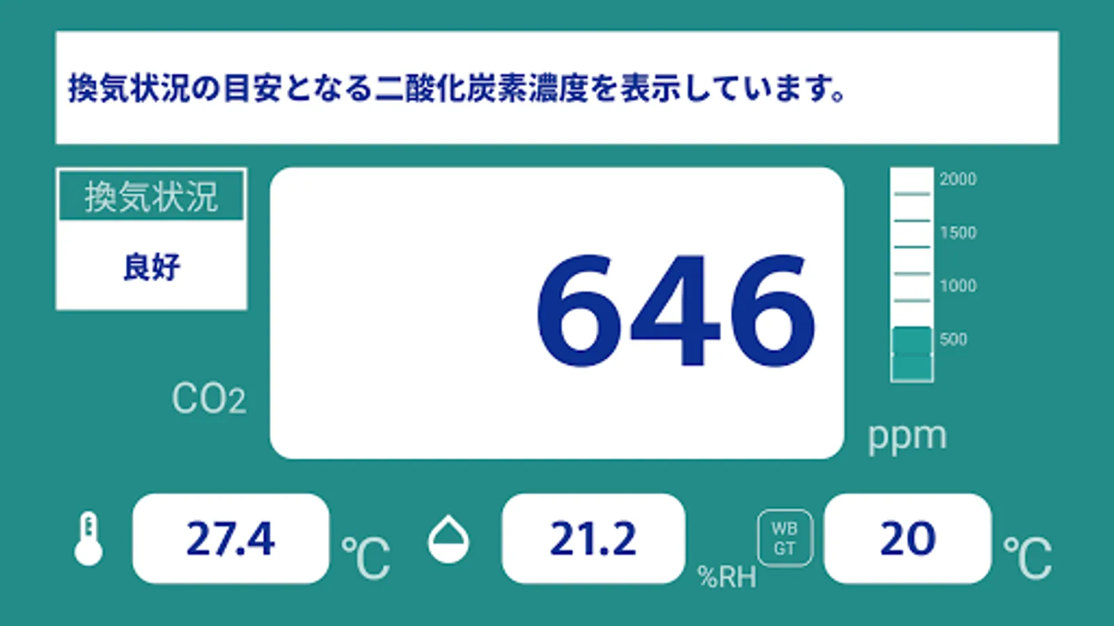It communicates with the carbon dioxide measuring instrument via Bluetooth and can display the carbon dioxide concentration, temperature, humidity, and WBGT (heat index) in real time.