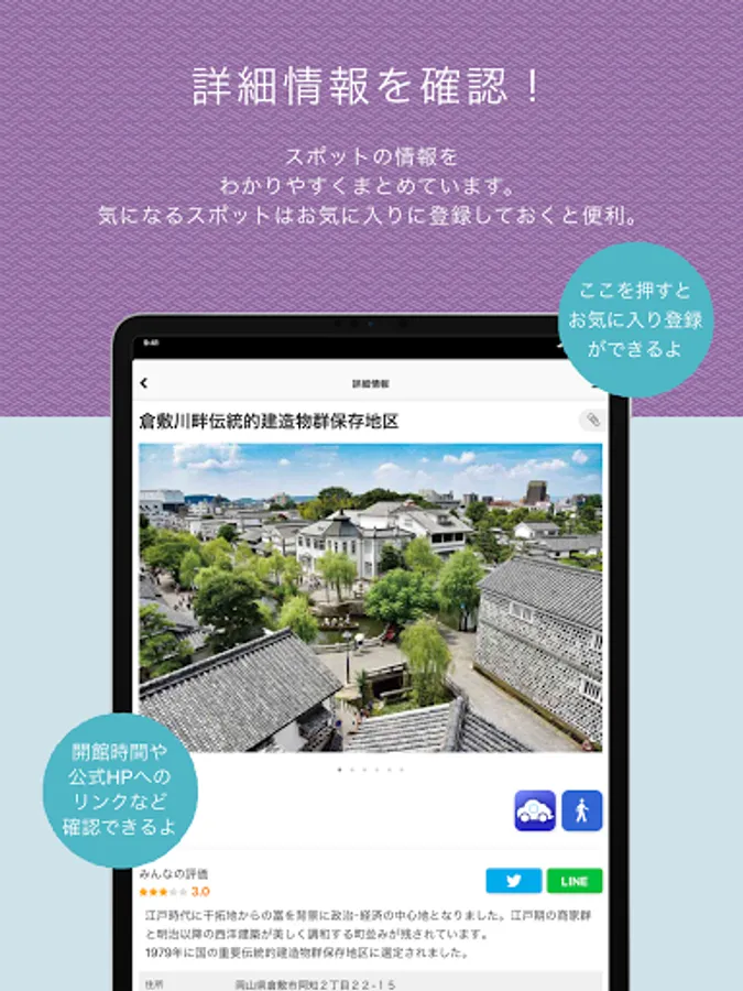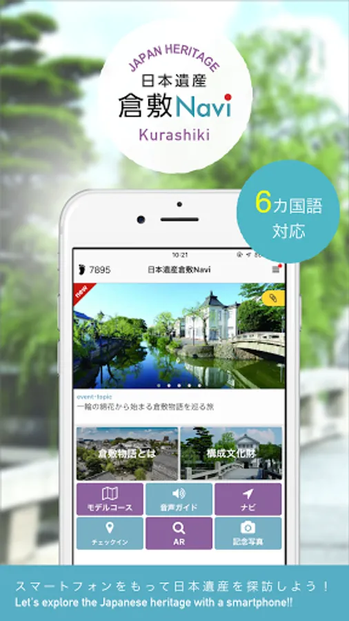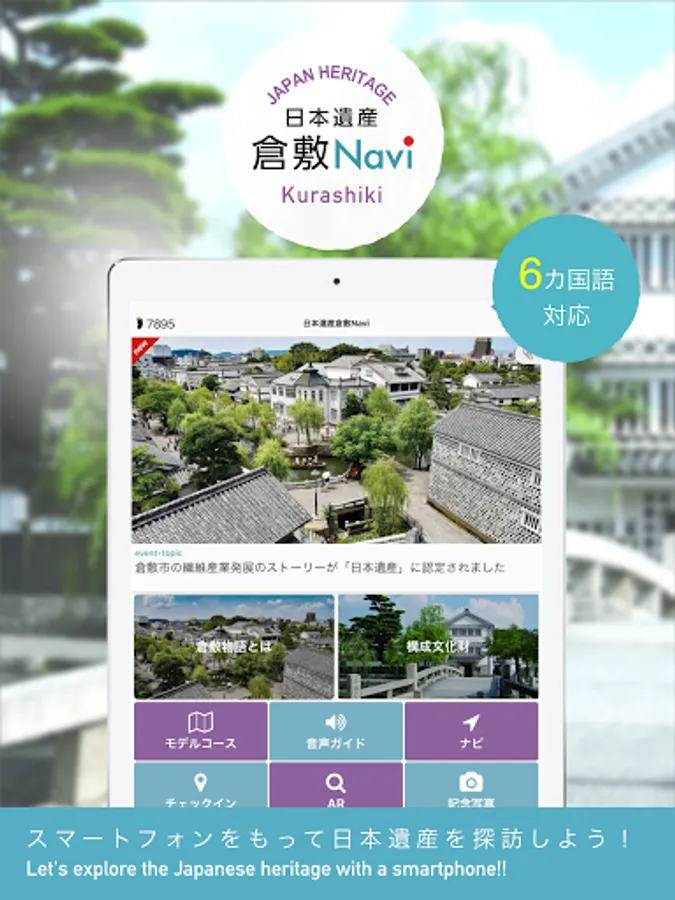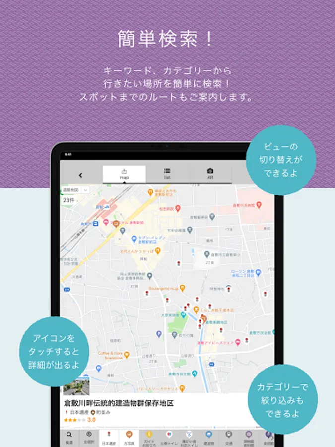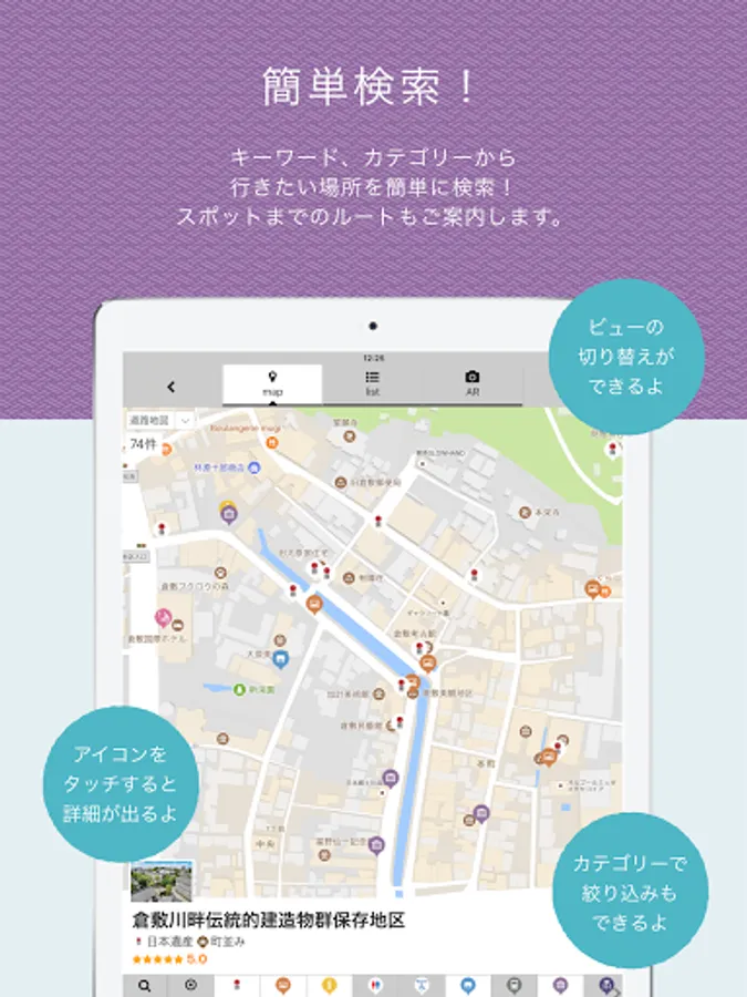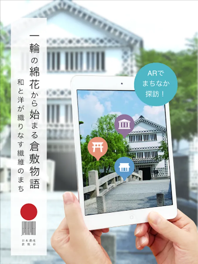 The app also provides a range of other content such as "souvenir photo" and "AR" features that allow you to have even more fun as you take a tour around Kurashiki's cultural properties and sightseeing spots.