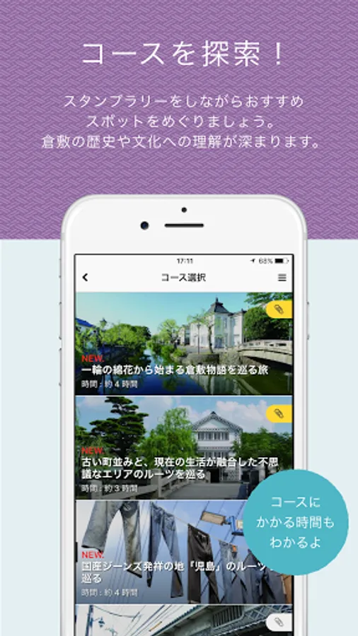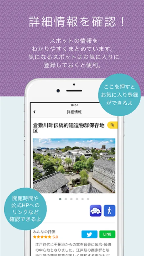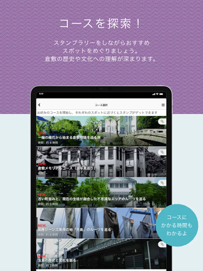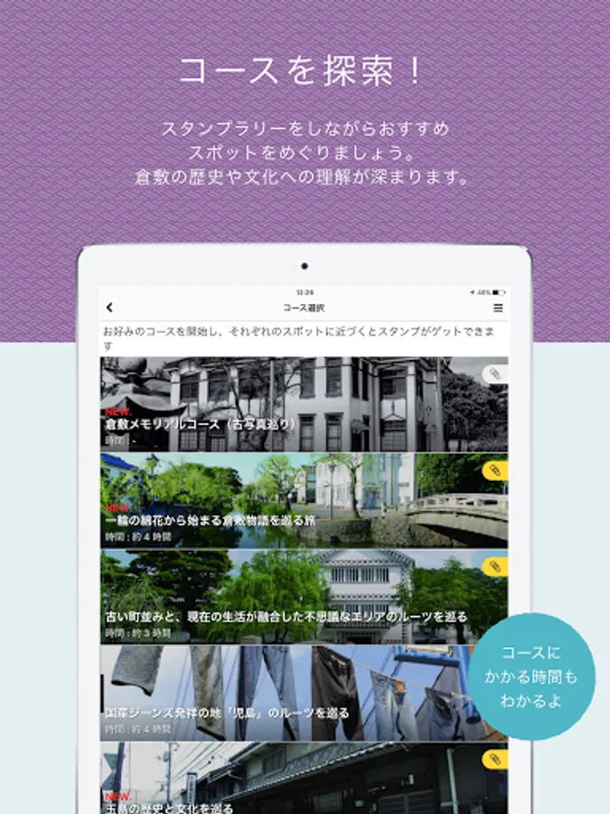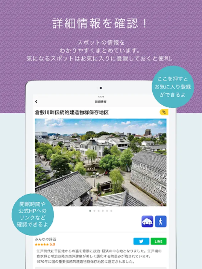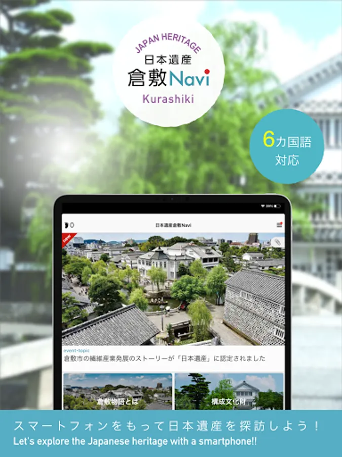 Kurashiki City in Okayama Prefecture has had its story "The story of Kurashiki begins with a single cotton plant - A textile town interweaving Japanese and Western textures -" certified as a Japan Heritage. This app provides a "model course" feature that introduces the cultural properties and story that make up the Japan Heritage as well as possible sightseeing routes, and a "navigation" feature that guides you to the places that you want to go, which you can select from a map or list. There is also an offline map that you can also use to navigate even without an Internet connection.