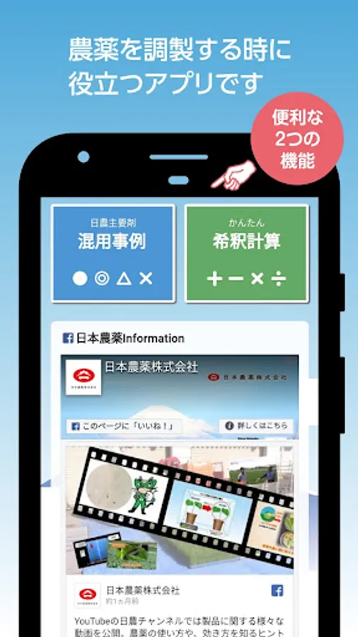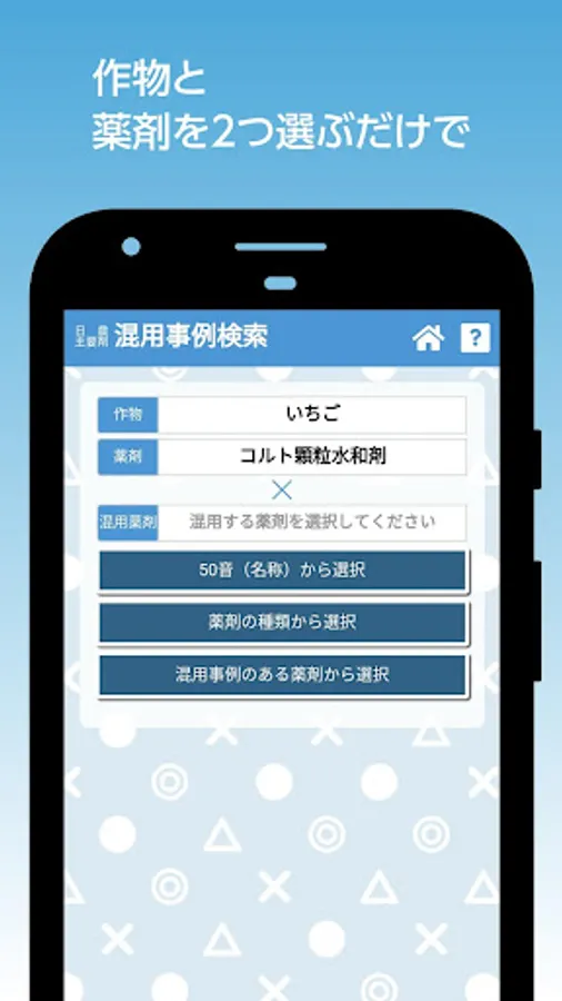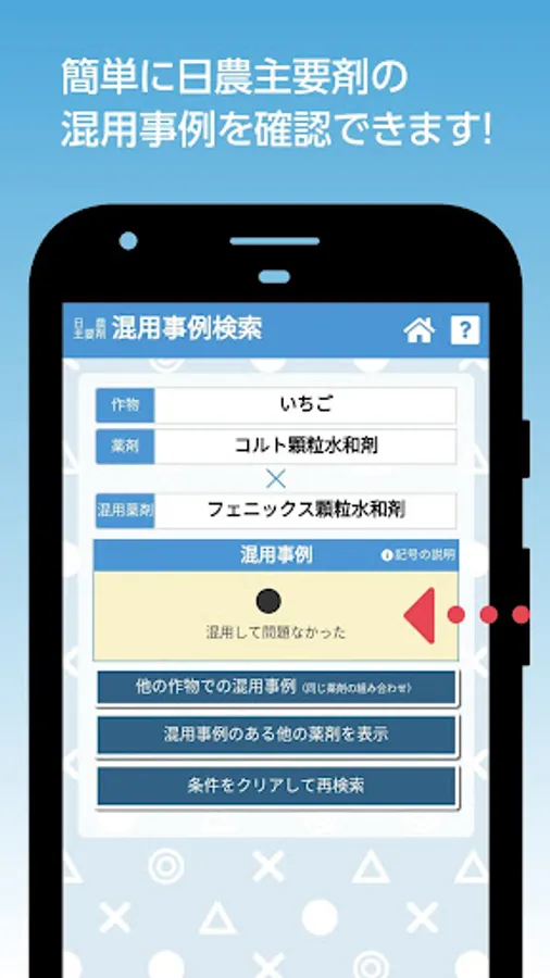 It is a function that allows you to check the mixed use cases of major Japanese pesticides (whether there was a problem with mixing, whether there was a problem, whether there was no problem if the conditions were observed, etc.).