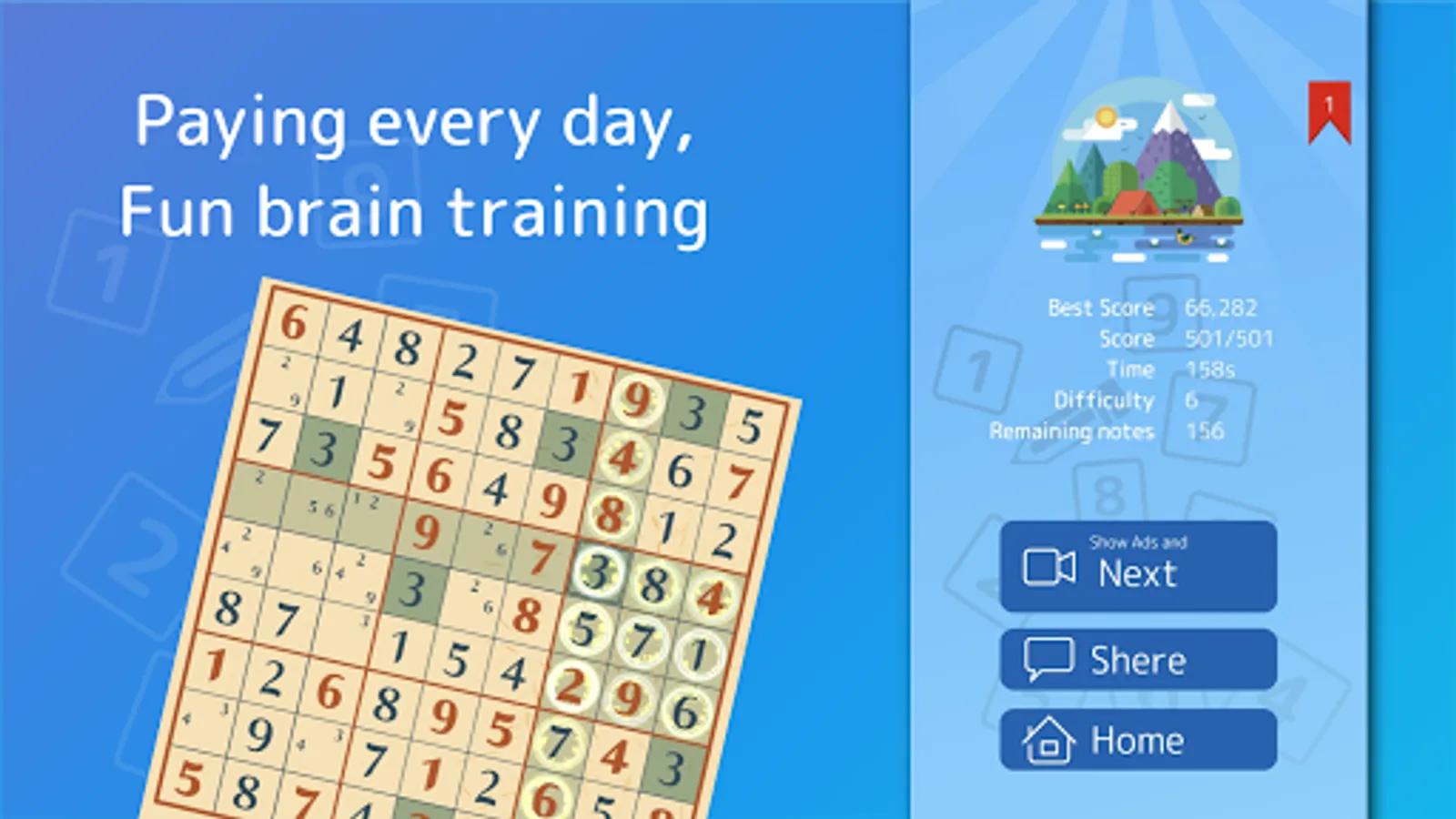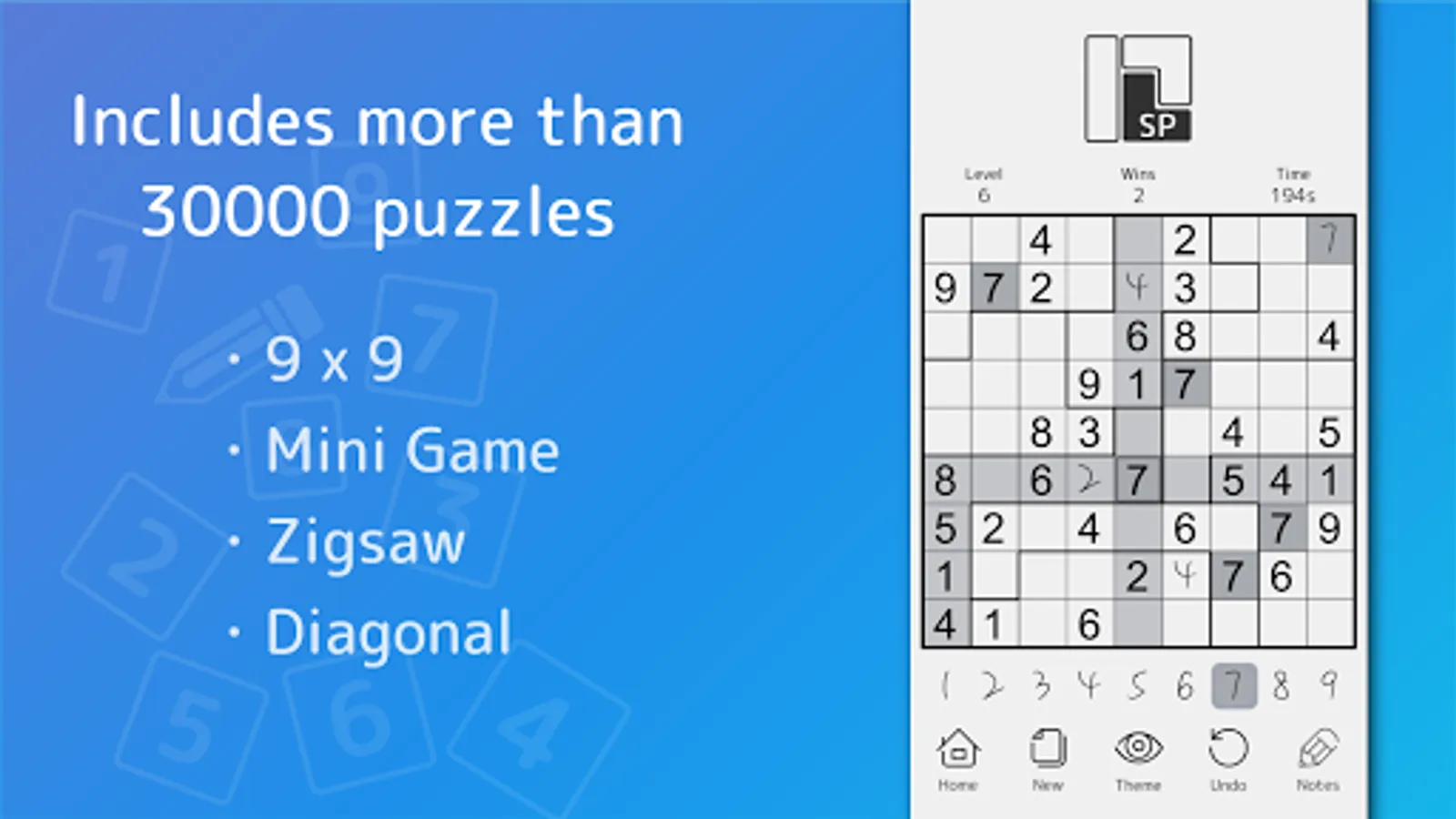 Sudoku(Number Place) is a puzzle game where you fill in a 9x9 grid divided into 3x3 blocks with the numbers 1-9.