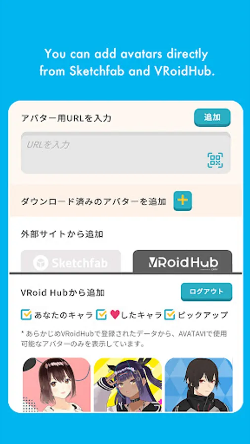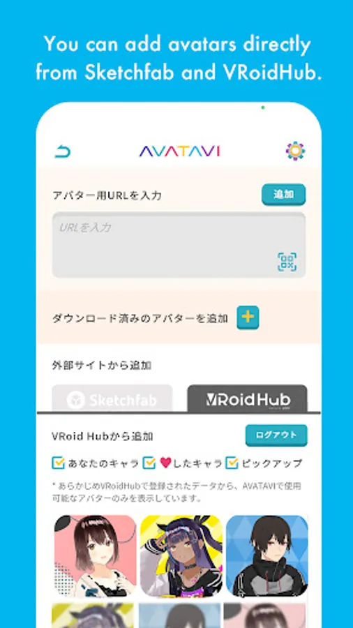 AVATAVI is integrated with Sketchfab and VRoidHub, the world's largest 3D model sharing platform, and you can search for and add avatars published by creators around the world.