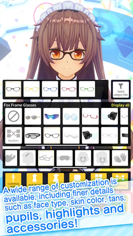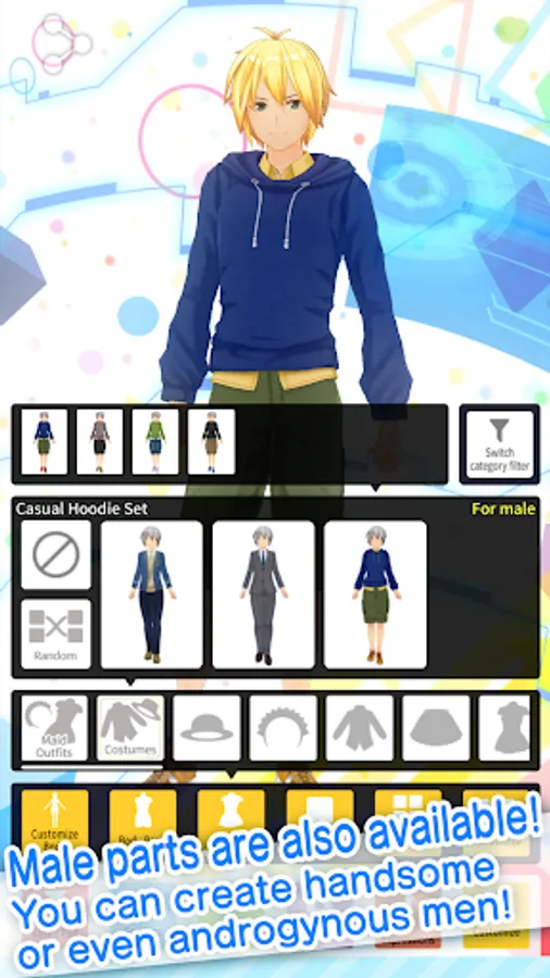 You can create your very own 3D character from a rich and wide variety of customization parts, such as hairstyle, clothes, skin color, face type and accessories.