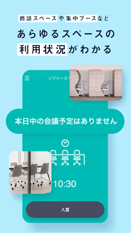 スマートフォンでも利用できるため、会議室だけでなく小規模な商談ブースやオープンスペースのソファ席など、あらゆるスペースに設置することで利用状況が把握可能になります。