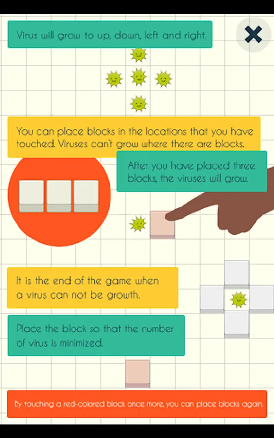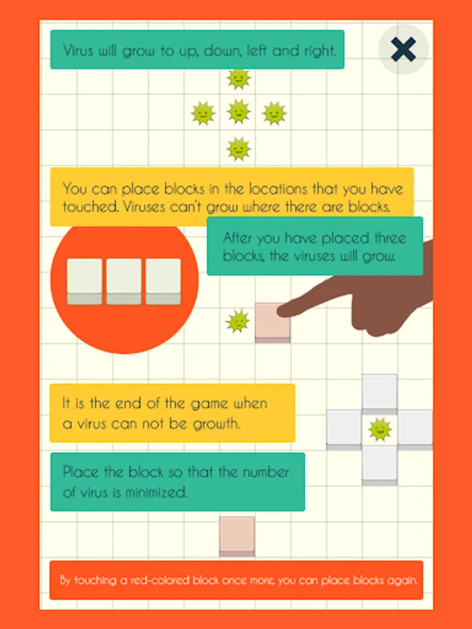 You can place blocks in the locations that you have touched. Viruses can’t grow where there are blocks. After you have placed three blocks, the viruses will grow. It is the end of the game when a virus can not be growth. Place the block so that the number of virus is minimized.