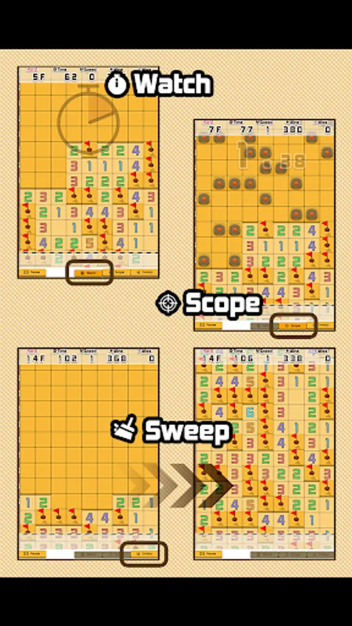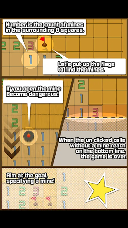 The numbers indicate how many mines are contained in the 8 neighboring cells. On/Off of a flag is made by carrying out the tap of the closed panel. A panel closed by the double-tap can be opened. When the tap of the number is carried out, and the surrounding number and number of a flag (mine) are the same, the panel except having stood the flag opens.