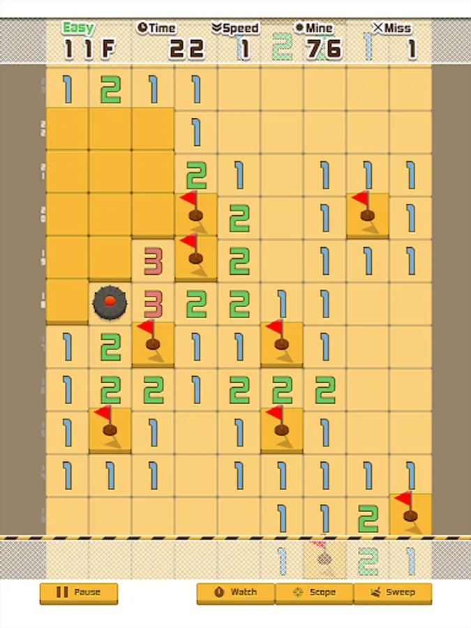 When you tap on the mine, you'll get a penalty. Uncover the cells using the number as a clue. When the un-tapped cells without a mine reach on the bottom line, the game is over.
