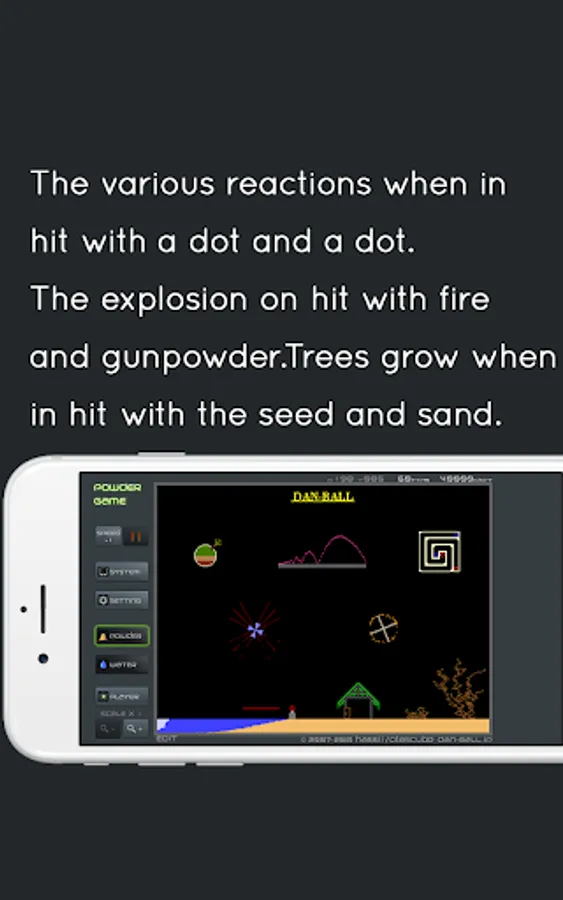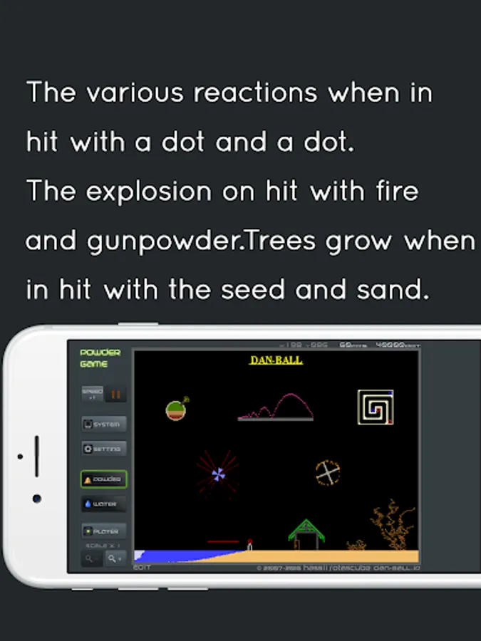 The various reactions when in hit with a dot and a dot. The explosion on hit with fire and gunpowder. Trees grow when in hit with the seed and sand.
