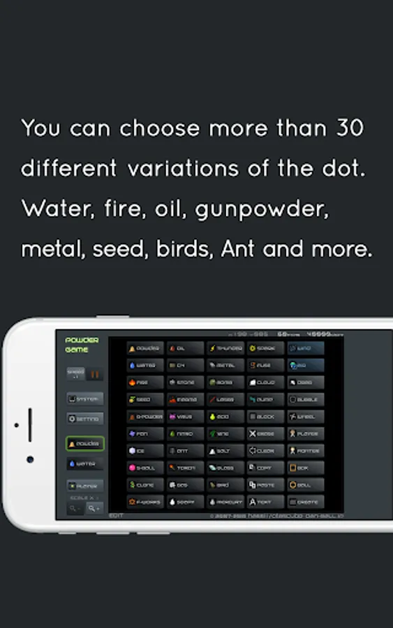You can choose more than 30 different variations of the dot. Water, fire, oil, gunpowder, metal, seed, birds, Ant and more.