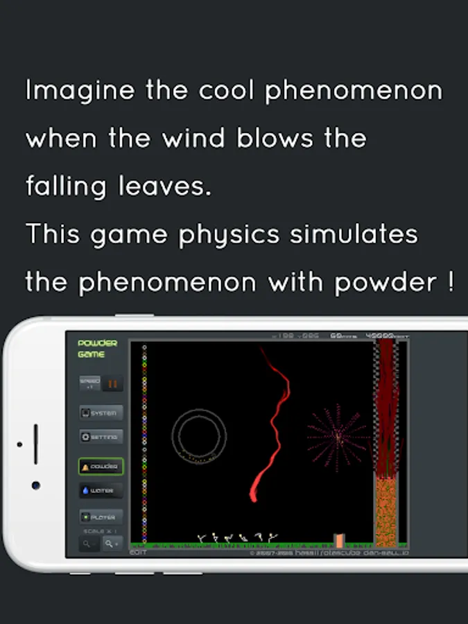 Imagine the cool phenomenon when the wind blows the falling leaves. This game physics simulates the phenomenon with powder (dots)!