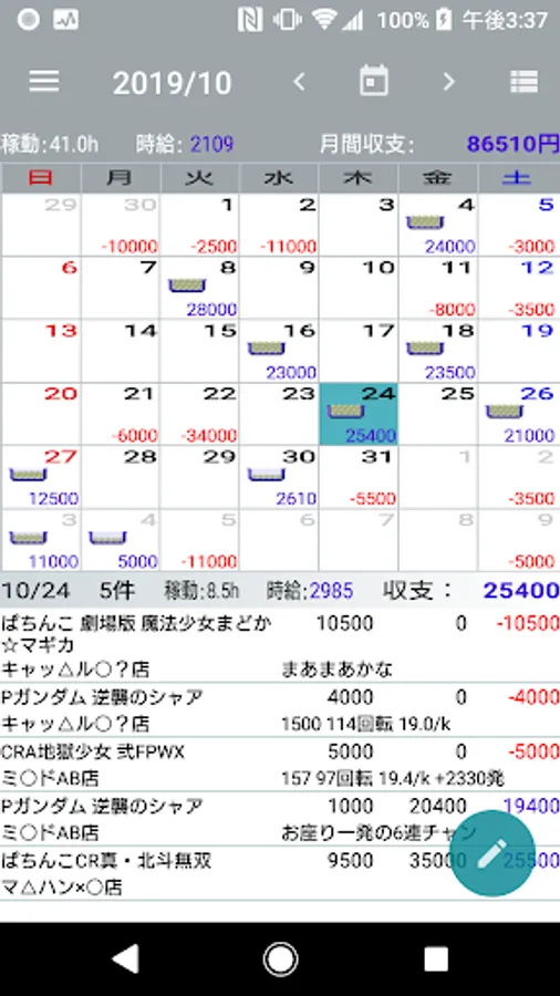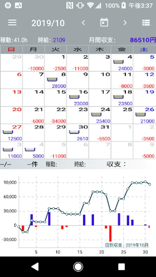 You can enter multiple incomes and expenditures per day, and the daily income and expenditure data will be listed under the calendar.