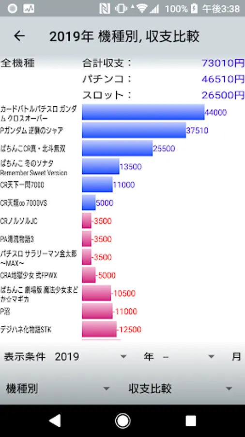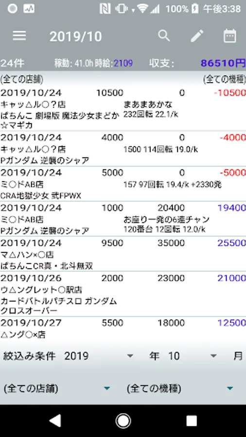 On this screen, you can narrow down the income and expenditure data by various conditions (year/month, store, model, characters in the memo), and you can aggregate the income and expenditure, hourly wage, and operating hours under the narrowed down conditions.
