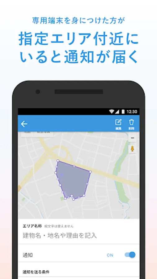 Draw the shape and set the area on the map. If those who have forbidden GPS terminal is in the vicinity of the area, you will receive a notification to the parent or guardian.
