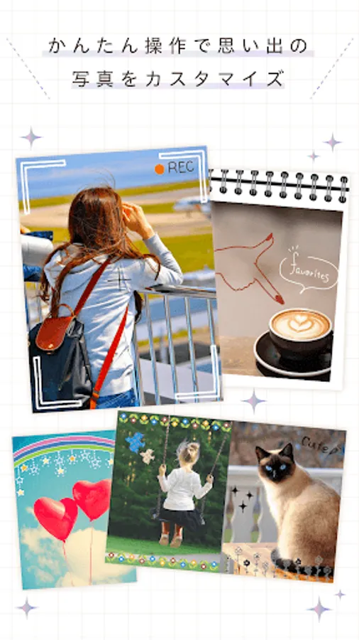 You can easily create attractive photos with one tap according to the image of the photo, such as a simple frame that complements the photo, a pop and cute handwritten design, a retro frame, etc. It automatically adjusts the placement of the frame according to the size of the photo, so there is no need for difficult techniques.