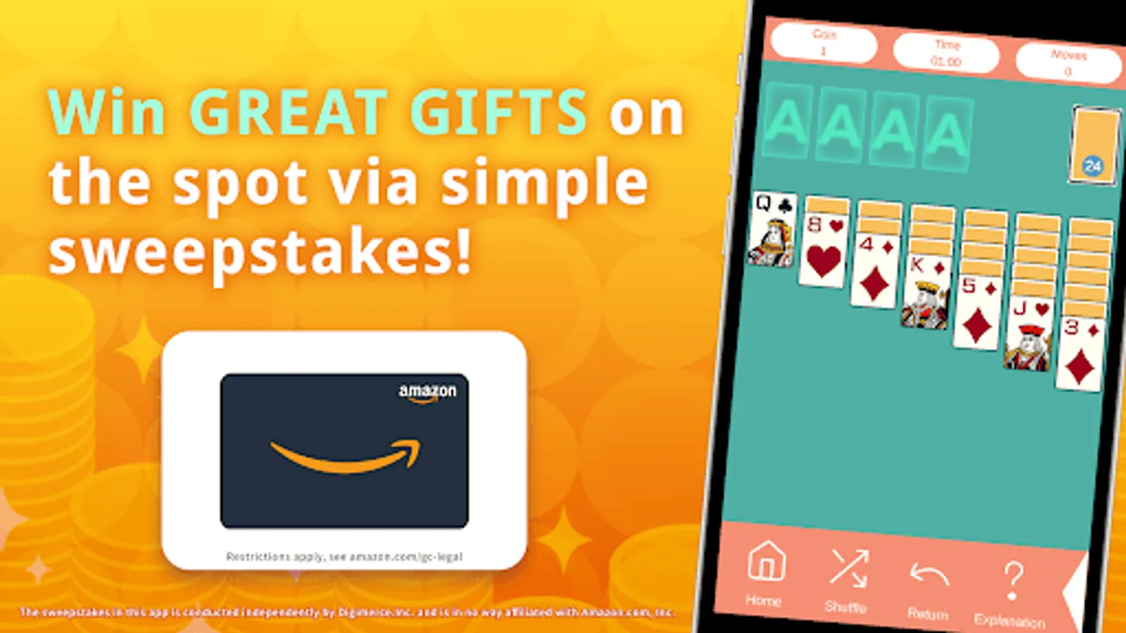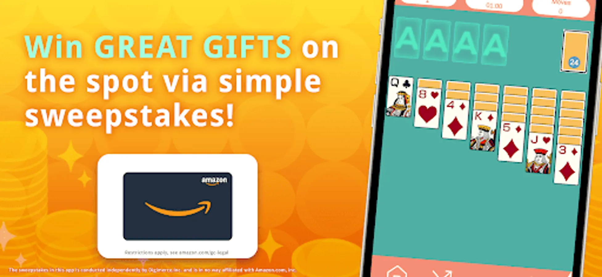 - Cash Rewards - Solitaire is free to play, with no in-app purchases.