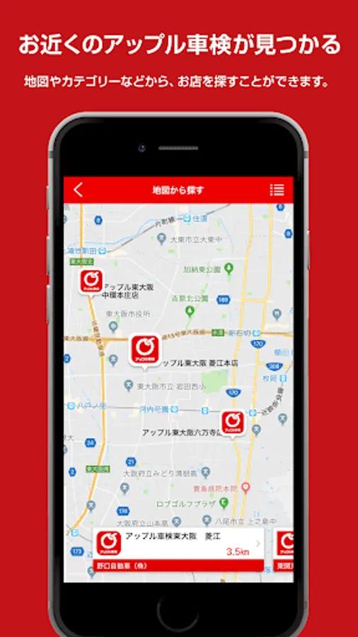 1. Within the application, it is possible to search nationwide Apple inspection shops in order from the current location or search from the map.