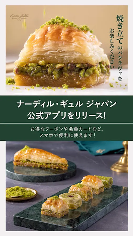 Founded in 1843. This is the official Japanese app for Nadir Gullu, a long-established luxury brand from Istanbul, Turkey, known as the "King of Baklava".