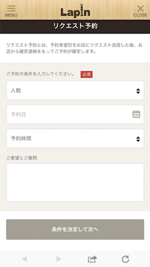 You can request a reservation simply by specifying the desired number of people, date and time, and sending.