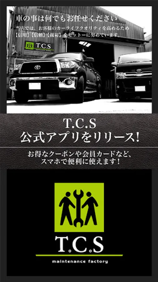 At T.C.S, we carry out various operations such as automobile sales, purchase, vehicle inspection, repair, inspection, sheet metal, painting, installation of parts, car audio, etc., body coating, car film construction, and various insurance handling. Please feel free to contact us.