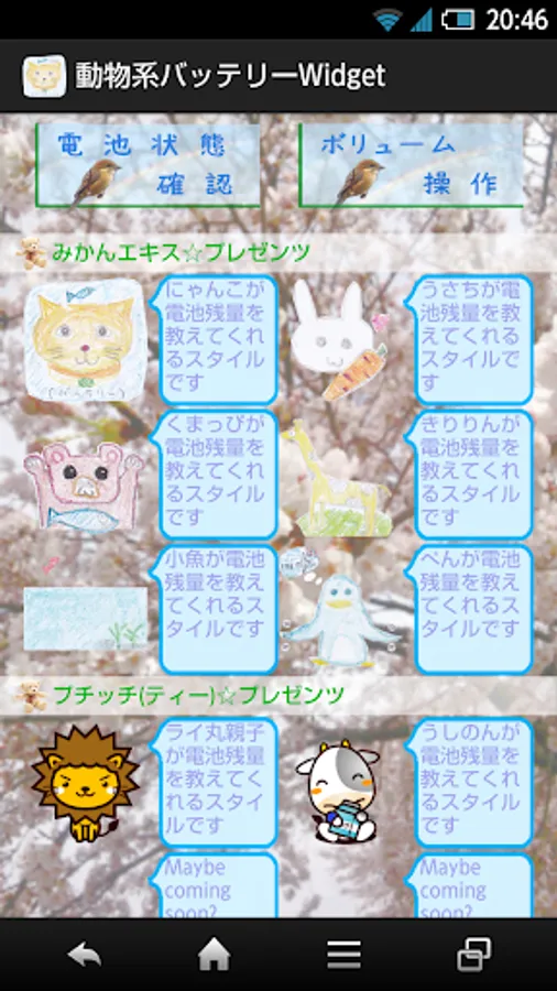 You can display the battery level (battery level) as a widget. The animals show various appearances and stories depending on the remaining battery power.