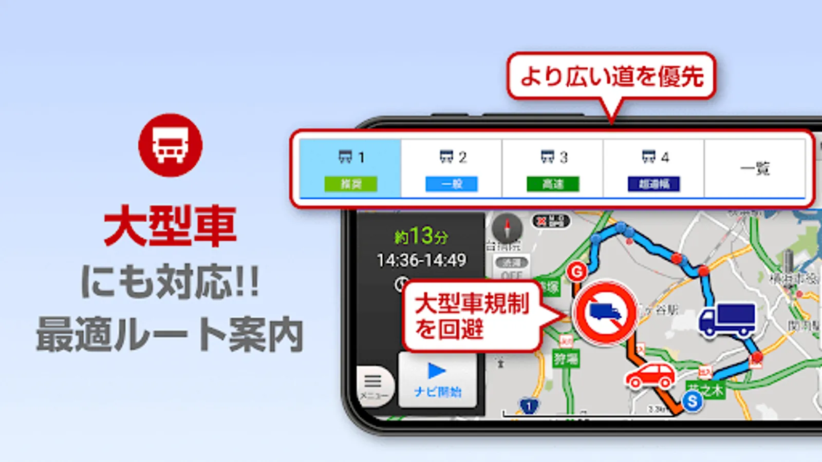 ・Avoid roads that large vehicles and trucks cannot pass, taking into account road widths and regulations for each vehicle type