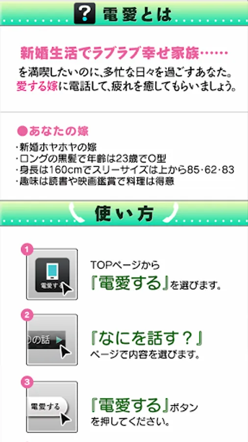 『電愛 ~愛し合うアプリ 新妻編~』は、スマートフォンの音声認識機能を用いて、新妻と会話をしながら愛を育むシチュエーションアプリです。