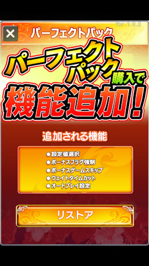 ※パーフェクトパック購入で、「ボーナスゲームスキップ」・「ウェイトタイムカット」が使えるようになります。
