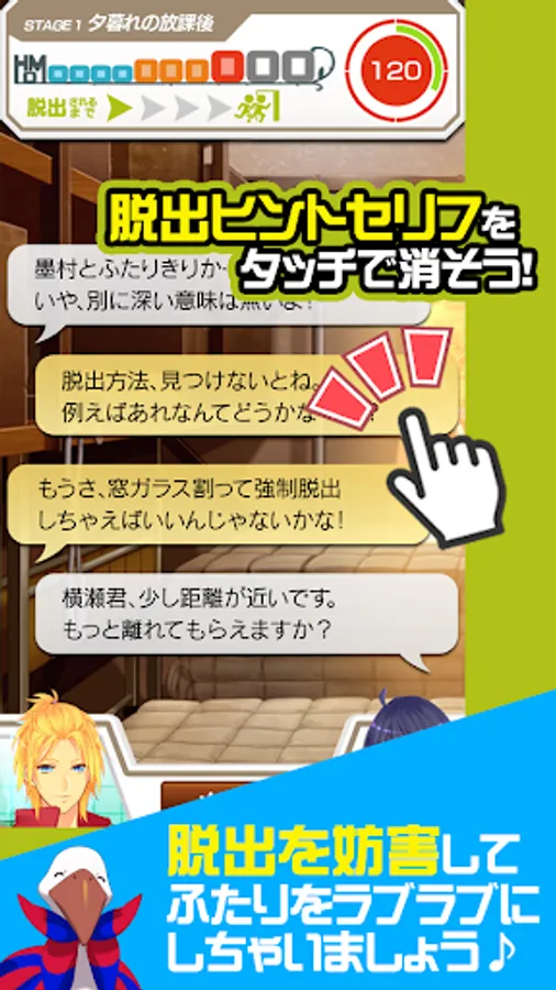「脱出ヒント」に気づいた黄色いフキダシをタッチで消して、脱出を阻止しましょう。