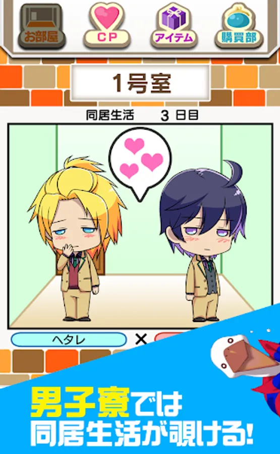 好きなキャラクターを二人選んで、寮での同居生活を覗き見できるモードです。