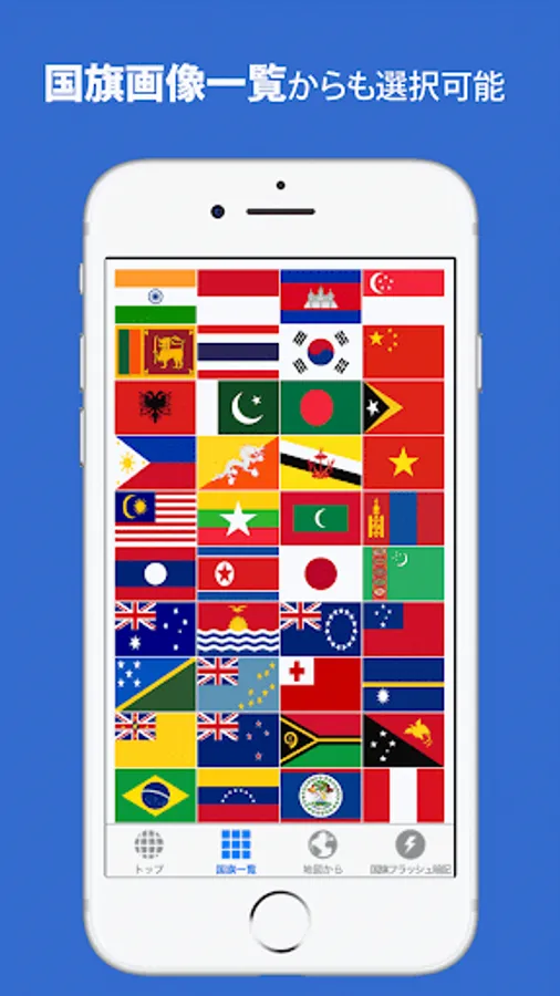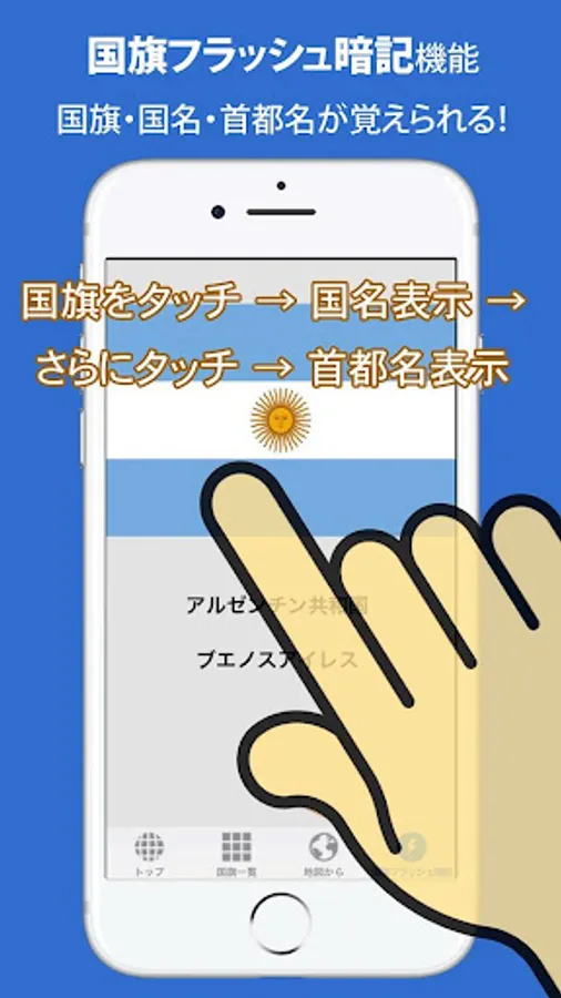 ・国旗をタップすると国名が表示され、さらにタップすると首都名が表示されます