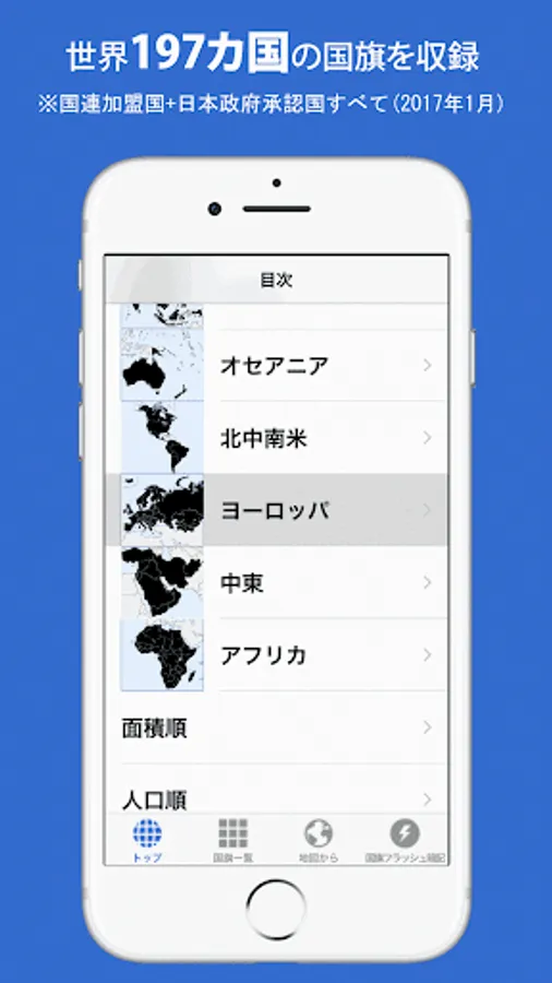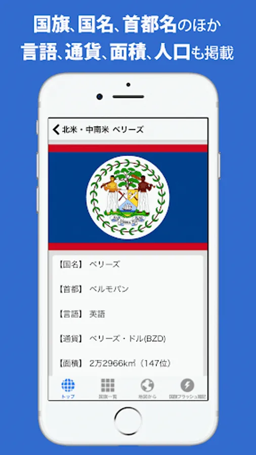 世界全197カ国の国旗画像と「国名・首都名・言語・通貨・面積・人口」を収録しています。また「国旗フラッシュ暗記」機能で国旗から国名・首都名を覚える事ができます。