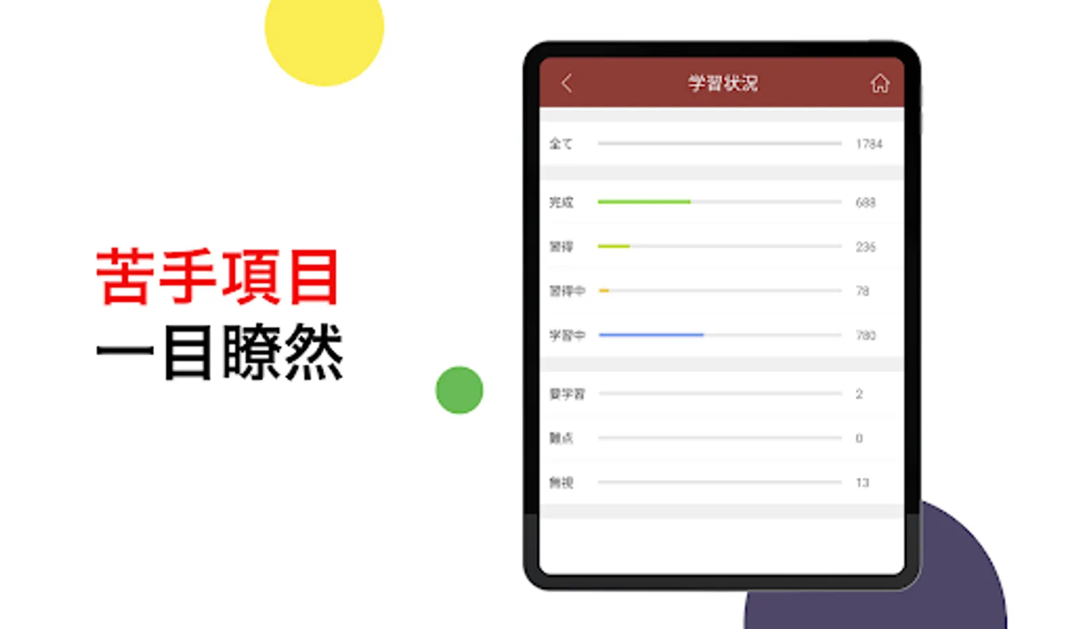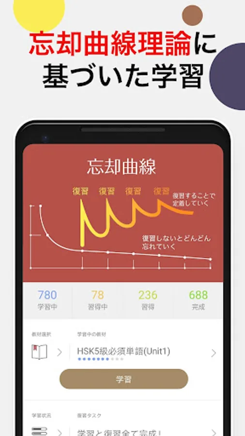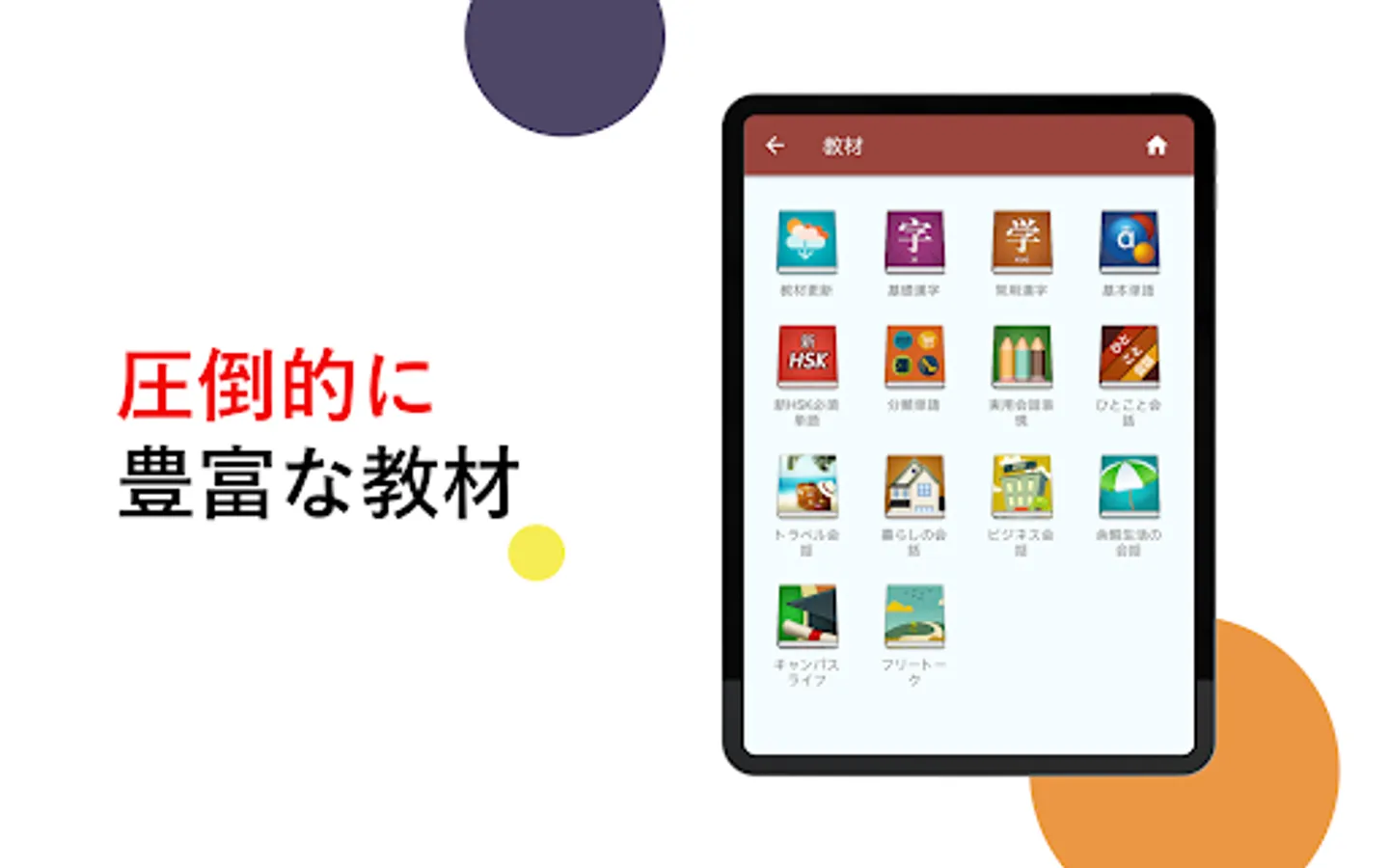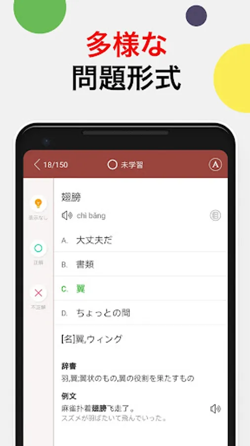 Questions such as selection formulas and quiz formulas are given according to the learning situation of Chinese. Easy learning just by tapping "I understand" or "I don't know"!