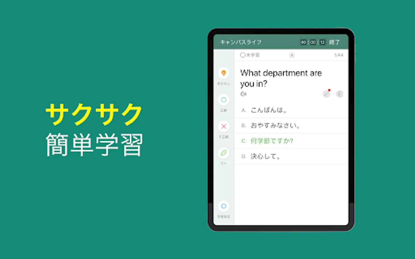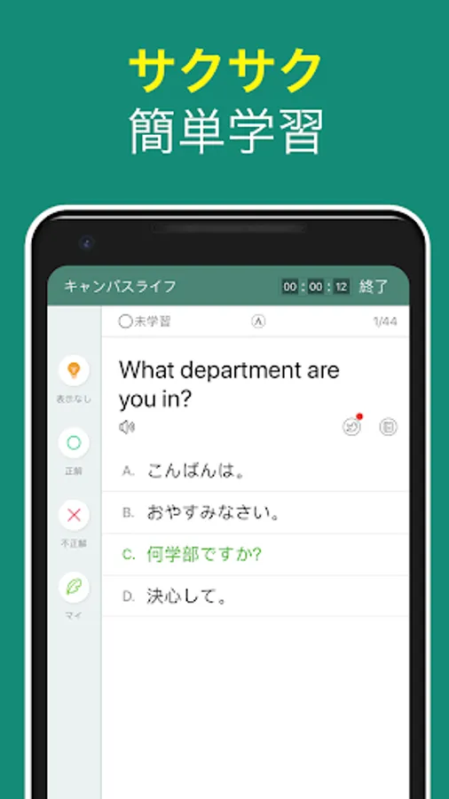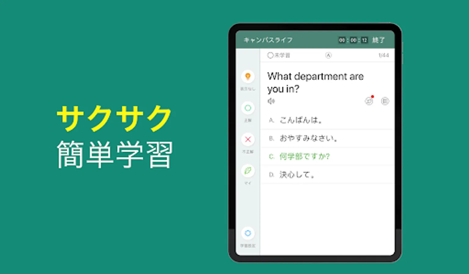 Questions will be given according to the learning situation of English conversation such as selection type and quiz type. Easy learning just by tapping "I understand" or "I don't know"!