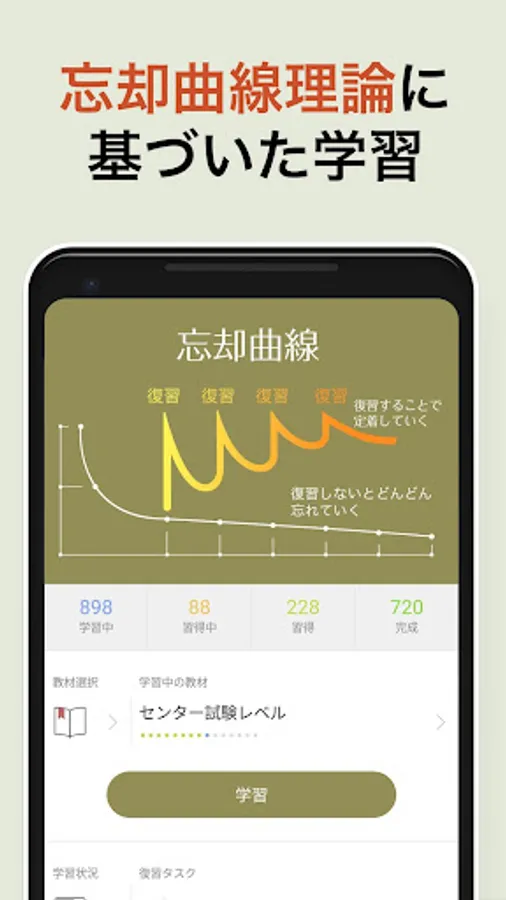 Efficient learning with an emphasis on review based on "forgetting curve theory". You will definitely learn by reviewing at the best time.