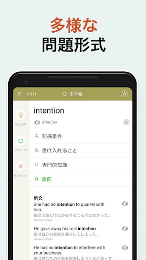Questions such as selection formulas and quiz formulas are given according to the acquisition status of English words. Easy learning just by tapping "I understand" or "I don't know"!