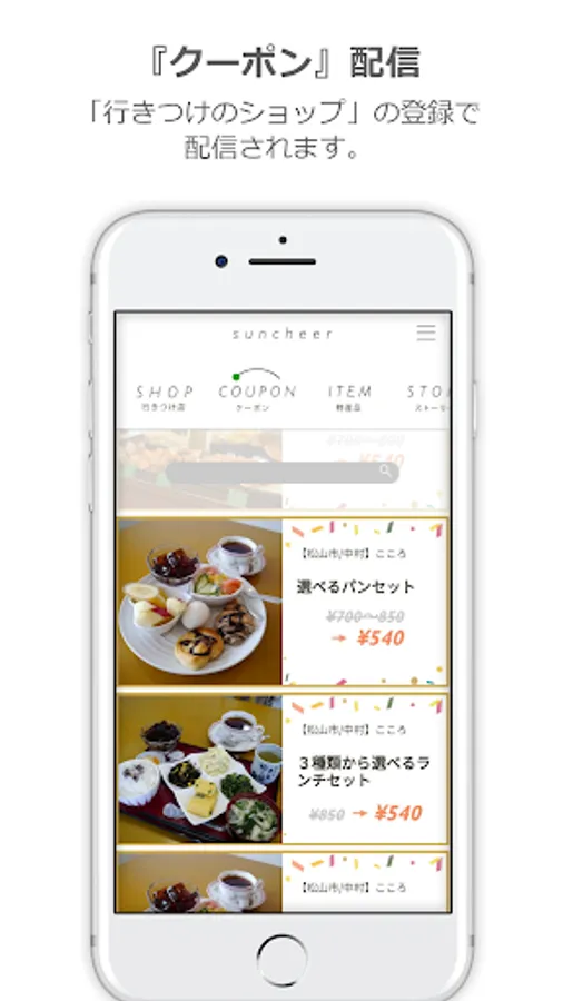 「suncheerギフトカード」をもらったショップ、登録した行きつけショップから、お得な情報のお知らせが届きます。