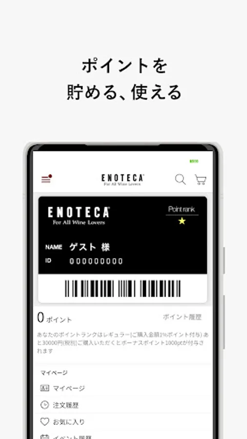 Points are common to wine shops nationwide and online, and 1% of the purchase amount is given (*). Accumulated points can be used as 1 point = 1 yen. * The grant rate changes depending on the rank.