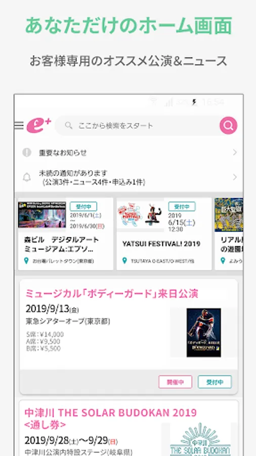 In addition to announcements of lottery results and ticket downloads that you definitely don't want to miss, shortcut functions that allow you to apply for tickets directly from your browsing history without searching, you can also receive recommended performances and news exclusively for you based on your favorite registration. Introducing.