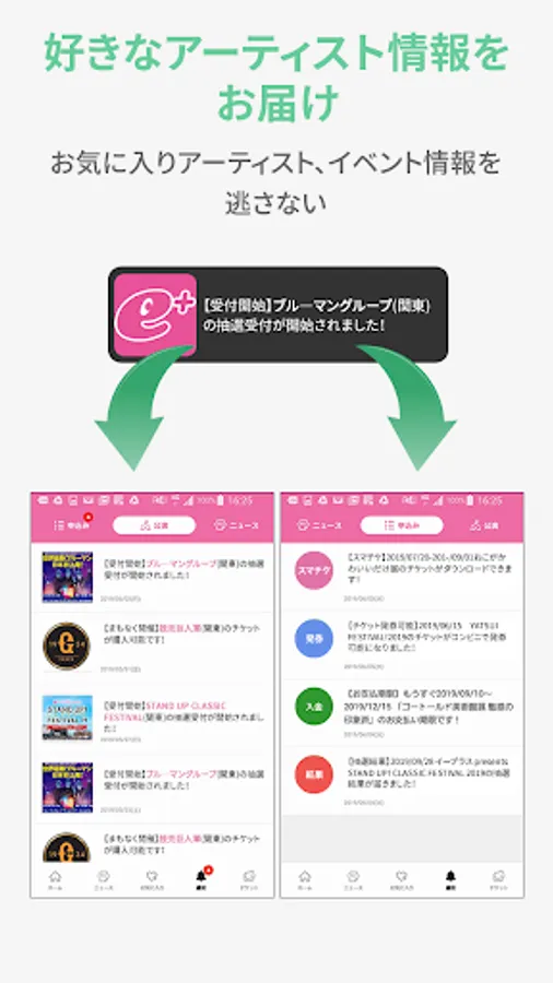We deliver ticket information and news of artists and events you have registered as favorites by tapping the heart by PUSH notification. Never miss out on pre-sale information. In addition, we will inform you of the ticket lottery results.