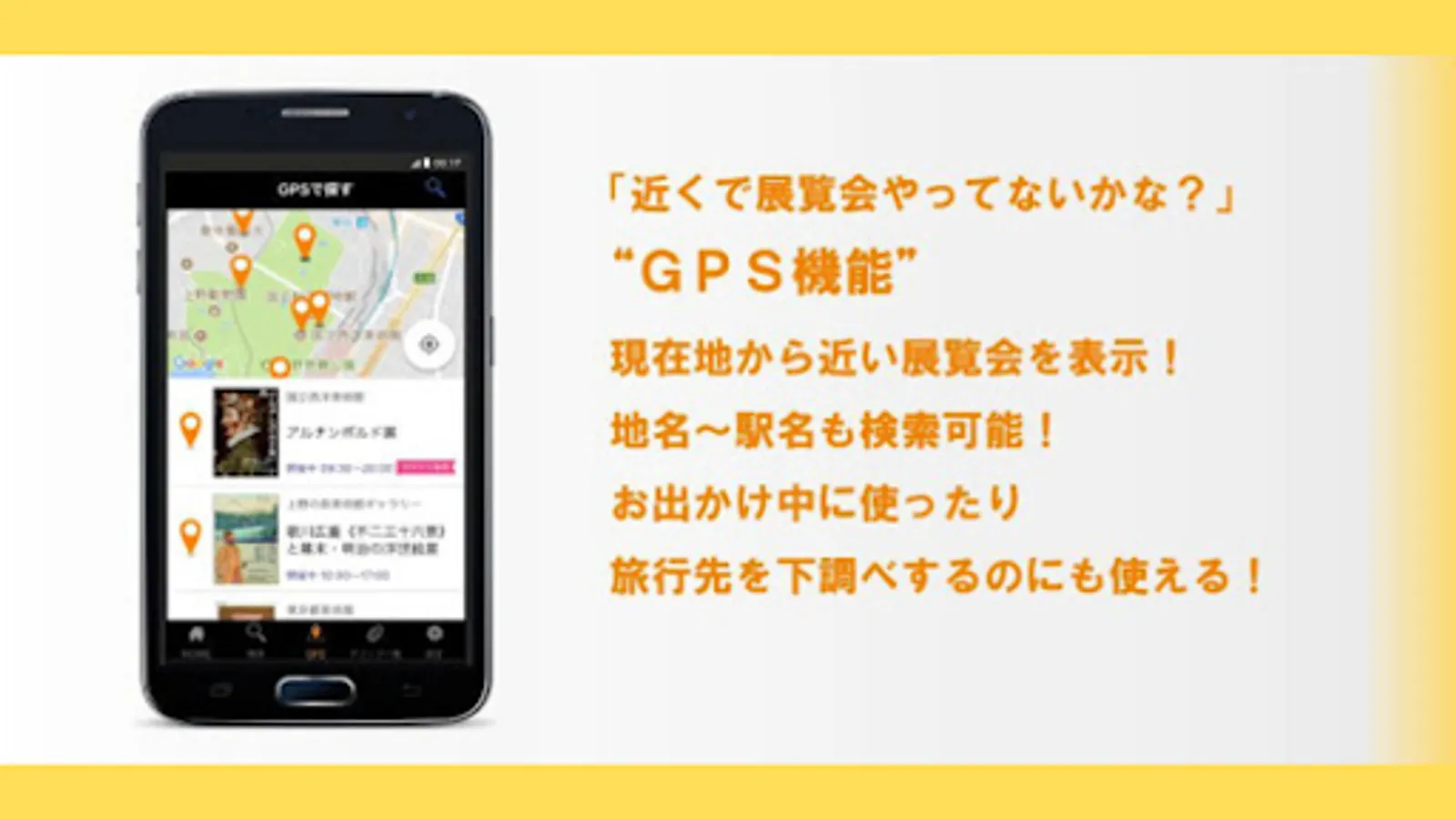 With the GPS function, you can check information on exhibitions held around your current location!