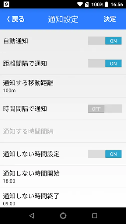 Automatic notification settings (travel distance, time interval, notification time, notification day of the week)