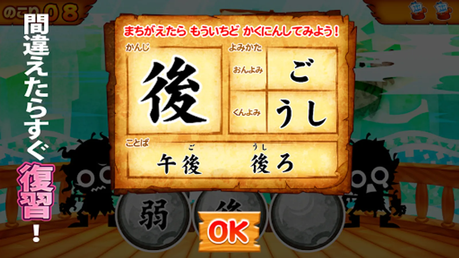 Answer the reading of the kanji written on the sail of the approaching pirate ship. If you answer correctly, you can shoot a cannon at your opponent! It's simple with three choices, so it's easy to remember and learn.