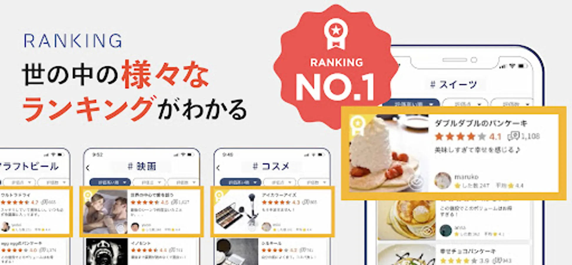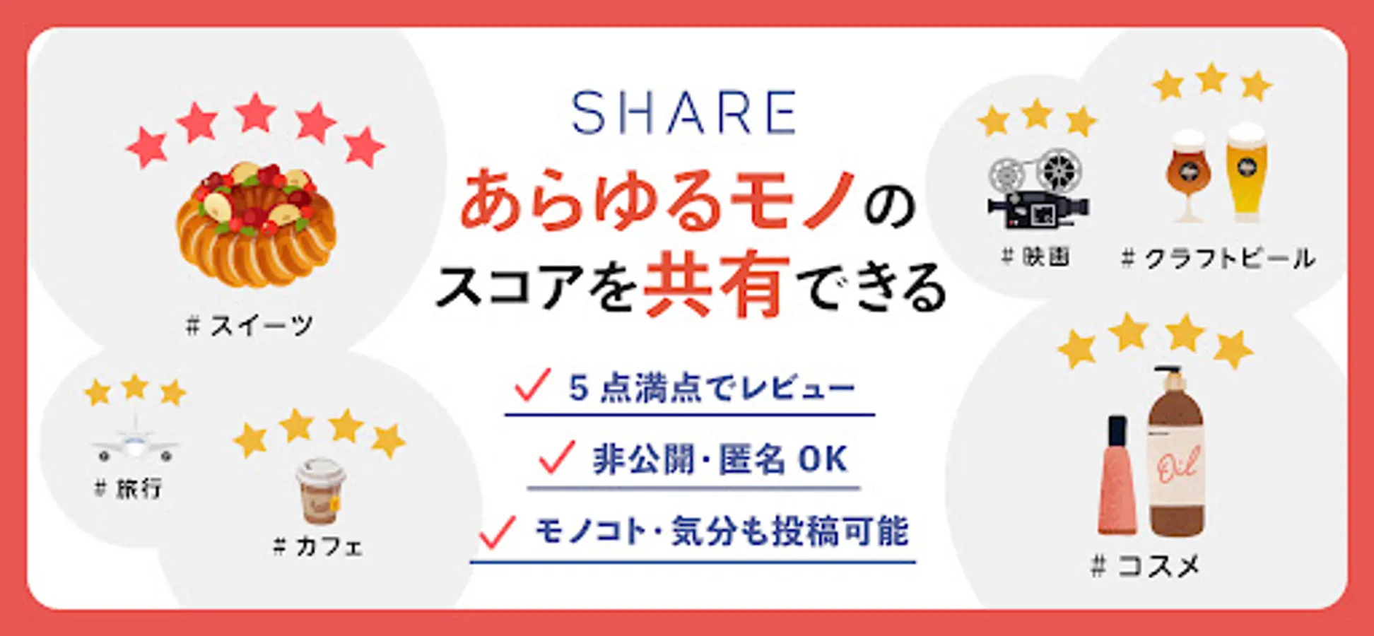 Movie / TV / Drama / Anime / Manga / Music / Game / Beauty / Diet / Beer / Sake / Wine / Sweets / Ice / Conveyor belt sushi / Hamburger / Fast food / Conveyor belt sushi / Curry / Cafe / Ramen / Cup ramen / Overseas travel / Hot springs / hotels / backorders / hometown tax payment / camp goods / campgrounds / fashion / accessories / 100 yen shops, etc., or you can have everyone evaluate your own songs and illustrations.