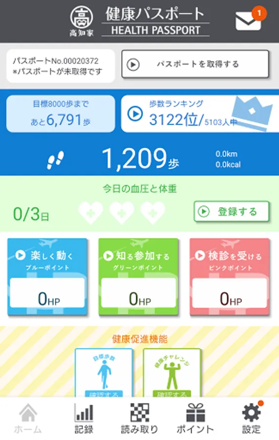 The "Kochi Family Health Passport" app is an app that allows you to collect healthy points by measuring your daily steps, home blood pressure, and weight, exchange them for point stickers, and apply for gift campaigns.