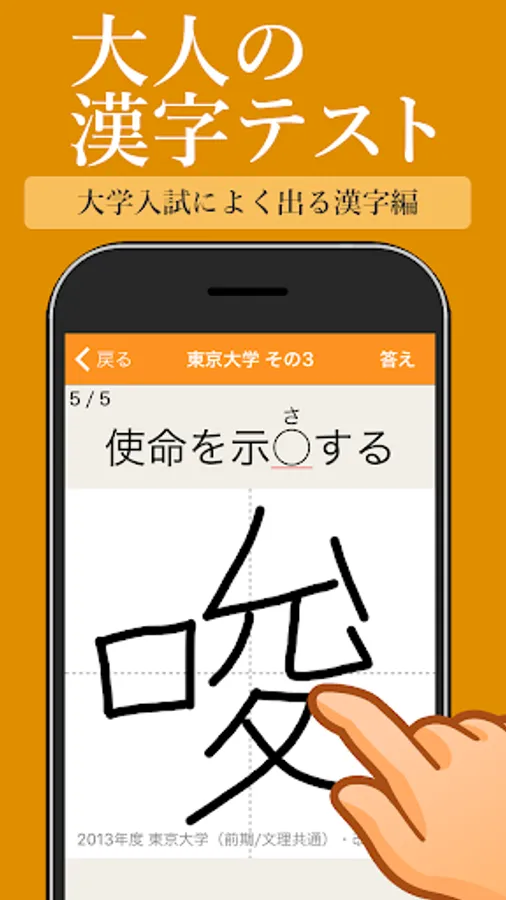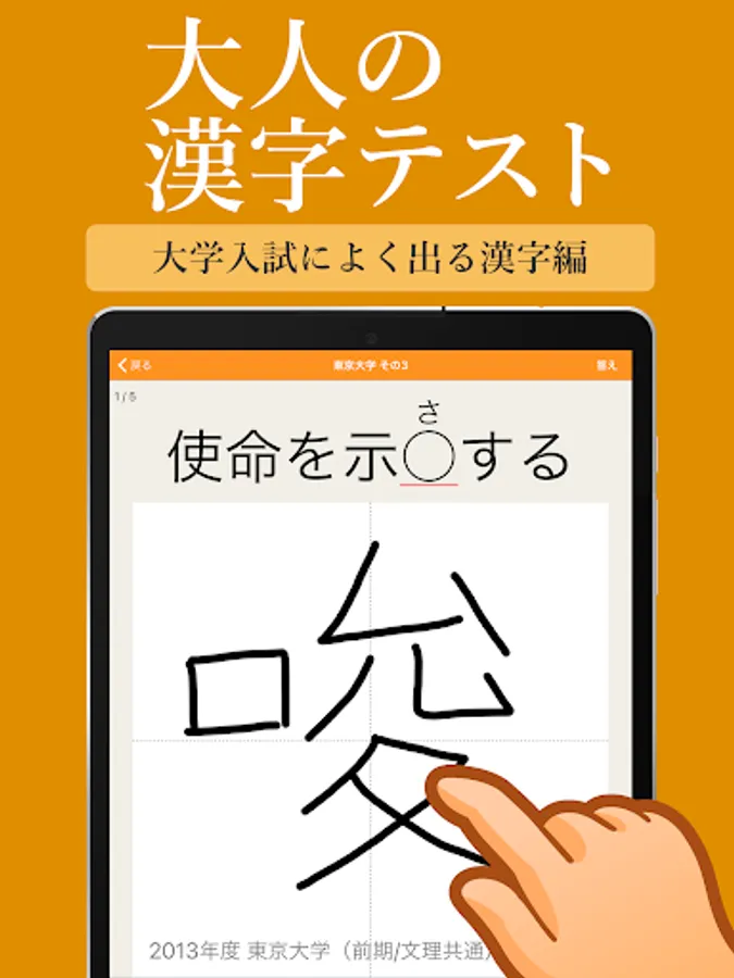 The Kanji questions that were actually asked at the University of Tokyo, Kyoto University, National Center Test, etc. have been changed to handwritten Kanji quizzes and recorded in this app!